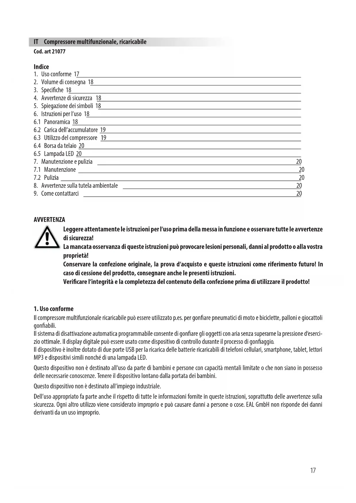 Il compressore multifunzionale ricaricabile può essere utilizzato p.es. per gonare pneumatici di moto e biciclette, palloni e giocattoli gonabili. Il sistema di disattivazione automatica programmabile consente di gonare gli oggetti con aria senza superarne la pressione d‘eserci- zio ottimale. Il display digitale può essere usato come dispositivo di controllo durante il processo di gonaggio. Il dispositivo è inoltre dotato di due porte USB per la ricarica delle batterie ricaricabili di telefoni cellulari, smartphone, tablet, lettori MP3 e dispositivi simili nonché di una lampada LED. Questo dispositivo non è destinato all‘uso da parte di bambini e persone con capacità mentali limitate o che non siano in possesso delle necessarie conoscenze. Tenere il dispositivo lontano dalla portata dei bambini. Questo dispositivo non è destinato all‘impiego industriale. Dell’uso appropriato fa parte anche il rispetto di tutte le informazioni fornite in queste istruzioni, soprattutto delle avvertenze sulla sicurezza. Ogni altro utilizzo viene considerato improprio e può causare danni a persone o cose. EAL GmbH non risponde dei danni derivanti da un uso improprio. IT Compressore multifunzionale, ricaricabile Cod. art 2107718
