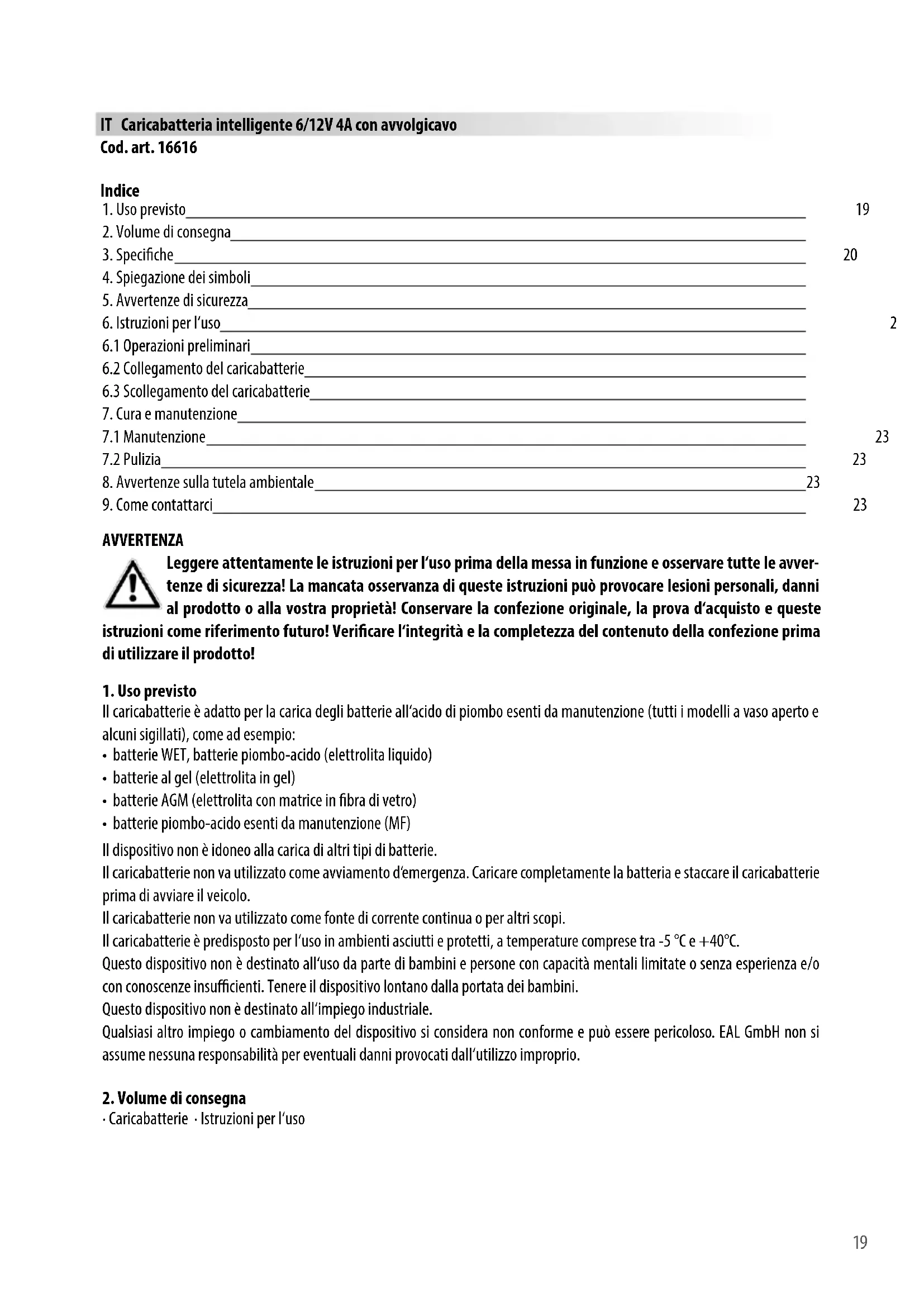 - batterie piombo-acido esenti da manutenzione (MF) Il dispositivo non è idoneo alla carica di altri tipi di batterie. Il caricabatterie non va utilizzato come avviamento d‘emergenza. Caricare completamente la batteria e staccare il caricabatterie prima di avviare il veicolo. Il caricabatterie non va utilizzato come fonte di corrente continua o per altri scopi. Il caricabatterie è predisposto per l‘uso in ambienti asciutti e protetti, a temperature comprese tra -5 °C e +40°C. Questo dispositivo non è destinato all‘uso da parte di bambini e persone con capacità mentali limitate o senza esperienza e/o con conoscenze insucienti. Tenere il dispositivo lontano dalla portata dei bambini. Questo dispositivo non è destinato all‘impiego industriale. Qualsiasi altro impiego o cambiamento del dispositivo si considera non conforme e può essere pericoloso. EAL GmbH non si assume nessuna responsabilità per eventuali danni provocati dall‘utilizzo improprio.