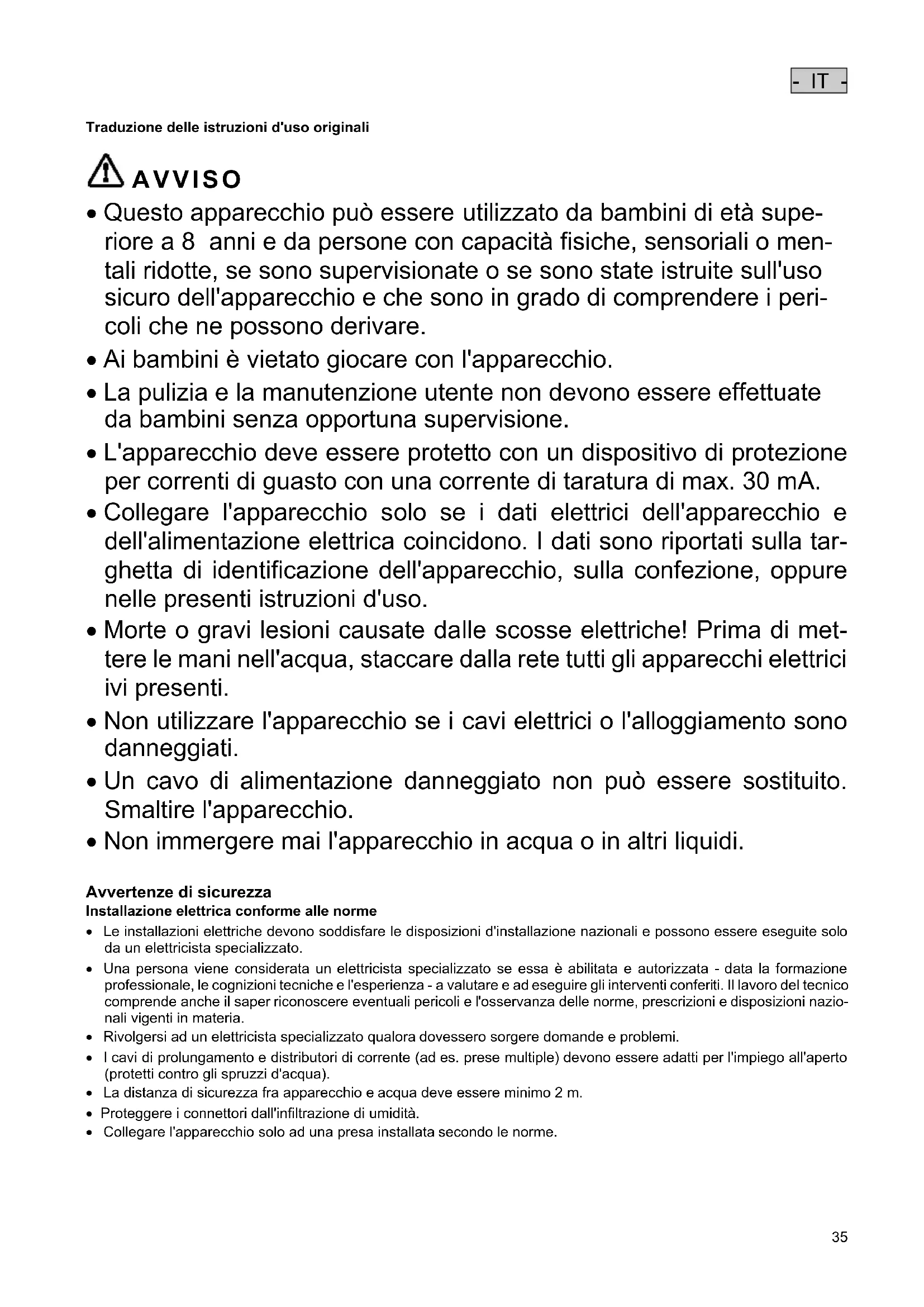 - Non immergere mai l'apparecchio in acqua o in altri liquidi. Avvertenze di sicurezza Installazione elettrica conforme alle norme