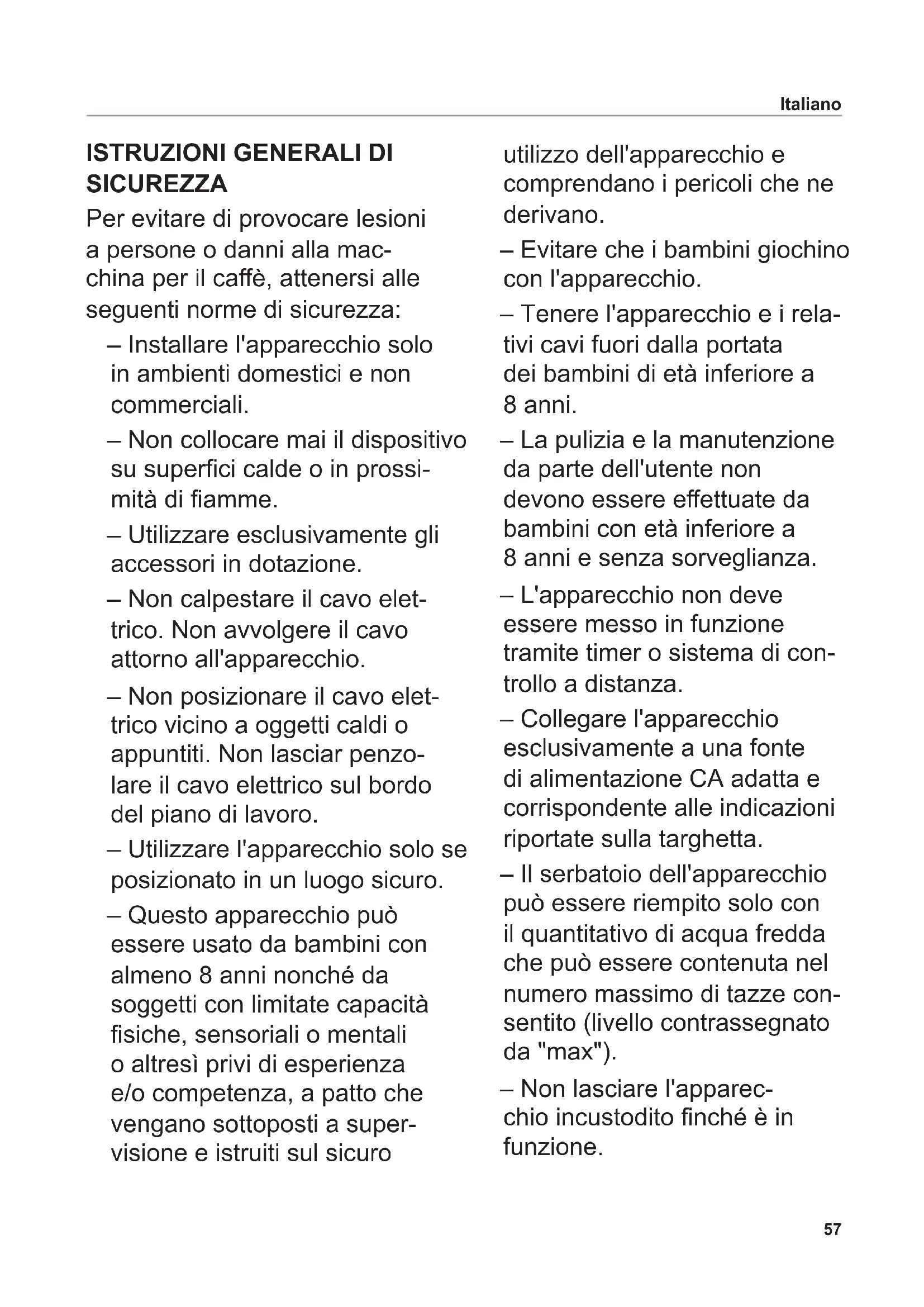 - Serrarlo spingendo la leva verso sinistra no a quando non scatta in posizione. Italiano61 PULIZIA Pulire la macchina per il caè regolarmente, per prevenire la formazione di sedimenti di calcare, che potrebbero compromettere le prestazioni dell'apparecchio. Indicazioni. – I componenti dell'apparecchio non possono essere lavati in lavastoviglie. – Non immergere mai la caraa termica (9) in acqua o altri liquidi, perché questi potreb- bero inltrarsi tra le pareti della caraa.