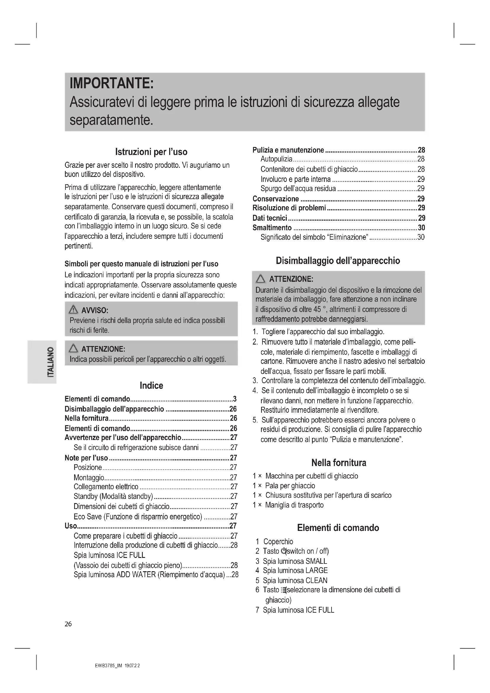 residui di produzione. Si consiglia di pulire l’apparecchio come descritto al punto “Pulizia e manutenzione”. Nella fornitura 1 × Macchina per cubetti di ghiaccio 1 × Pala per ghiaccio 1 × Chiusura sostitutiva per l’apertura di scarico 1 × Maniglia di trasporto Elementi di comando 1 Coperchio 2 Tasto (switch on / off) 3 Spia luminosa SMALL 4 Spia luminosa LARGE 5 Spia luminosa CLEAN 6 Tasto (selezionare la dimensione dei cubetti di ghiaccio) 7 Spia luminosa ICE FULLEWB3785_IM 19.07.2 2