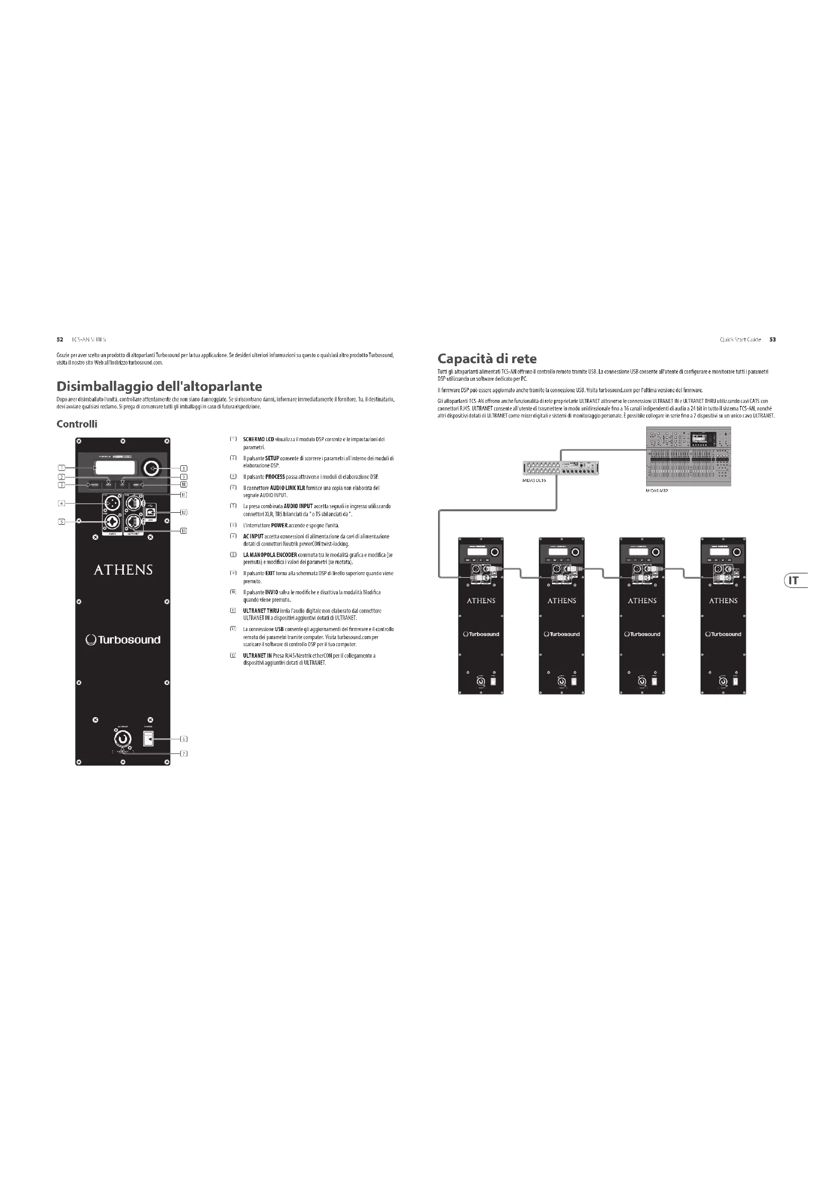 BEFORE AFTER Fig. 1 Fig. 4 Fig. 5 Fig. 6 Fig. 2 Fig. 352 TCS-AN SERIES Quick Start Guide 53 Grazie per aver scelto un prodotto di altoparlanti Turbosound per la tua applicazione. Se desideri ulteriori informazioni su questo o qualsiasi altro prodotto Turbosound, visita il nostro sito Web all'indirizzo turbosound.com. Disimballaggio dell'altoparlante Dopo aver disimballato l'unità, controllare attentamente che non siano danneggiate. Se si riscontrano danni, informare immediatamente il fornitore. Tu, il destinatario, devi avviare qualsiasi reclamo. Si prega di conservare tutti gli imballaggi in caso di futura rispedizione. Controlli (1) SCHERMO LCD visualizza il modulo DSP corrente e le impostazioni dei parametri. (2) Il pulsante SETUP consente di scorrere i parametri all'interno dei moduli di elaborazione DSP. (3) Il pulsante PROCESS passa attraverso i moduli di elaborazione DSP. (4) Il connettore AUDIO LINK XLR fornisce una copia non elaborata del segnale AUDIO INPUT. (5) La presa combinata AUDIO INPUT accetta segnali in ingresso utilizzando connettori XLR, TRS bilanciati da " o TS sbilanciati da ". (6) L'interruttore POWER accende e spegne l'unità. (7) AC INPUT accetta connessioni di alimentazione da cavi di alimentazione dotati di connettori Neutrik powerCON twist-locking. (8) LA MANOPOLA ENCODER commuta tra le modalità graca e modica (se premuta) e modica i valori dei parametri (se ruotata). (9) Il pulsante EXIT torna alla schermata DSP di livello superiore quando viene premuto. (10) Il pulsante INVIO salva le modiche e disattiva la modalità Modica quando viene premuto. (11) ULTRANET THRU invia l'audio digitale non elaborato dal connettore ULTRANET IN a dispositivi aggiuntivi dotati di ULTRANET. (12) La connessione USB consente gli aggiornamenti del rmware e il controllo remoto dei parametri tramite computer. Visita turbosound.com per scaricare il software di controllo DSP per il tuo computer. (13) ULTRANET IN Presa RJ45/Neutrik etherCON per il collegamento a dispositivi aggiuntivi dotati di ULTRANET. (6) (7) (9) (10) (11) (13) (8) (1) (2) (3) (4) (5) (12) Capacità di rete Tutti gli altoparlanti alimentati TCS-AN orono il controllo remoto tramite USB. La connessione USB consente all'utente di congurare e monitorare tutti i parametri DSP utilizzando un software dedicato per PC. Il rmware DSP può essere aggiornato anche tramite la connessione USB. Visita turbosound.com per l'ultima versione del rmware. Gli altoparlanti TCS-AN orono anche funzionalità di rete proprietarie ULTRANET attraverso le connessioni ULTRANET IN e ULTRANET THRU utilizzando cavi CAT5 con connettori RJ45. ULTRANET consente all'utente di trasmettere in modo unidirezionale no a 16 canali indipendenti di audio a 24 bit in tutto il sistema TCS-AN, nonché altri dispositivi dotati di ULTRANET come mixer digitali e sistemi di monitoraggio personale. È possibile collegare in serie no a 7 dispositivi su un unico cavo ULTRANET. MIDAS M32MIDAS DL1654 TCS-AN SERIES Quick Start Guide 55 Struttura del menu TCS-AN DSP Gamma completa Subwoofer Funzione PROCESSI EQ Nessuno Nessuno Imposta la risposta in frequenza all'impostazione predenita. Array2 – Imposta una risposta in frequenza corretta per 2 cabinet disposti insieme. Array3 – Imposta una risposta in frequenza corretta per 3 o più cabinet disposti insieme. Utente Utente Consente di denire la propria impostazione della risposta in frequenza accedendo al sottomenu corrispondente. Sottomenu Scaalature basse/alte Scaalature basse/alte Consente di denire un ltro shelving basso e alto. Parametrico 1 e 2 Parametrico 1 e 2 Consente di denire un equalizzatore parametrico di tipo campana (Frequency, Qual. and Gain). XOVER Nessuno – L'unità è impostata per la riproduzione a gamma intera predenita. HP 100 Hz LP 100 Hz Preimpostato con ltro 100 Hz, 24 dB/ottava per il crossover tra subwoofer e altoparlanti full range. HP 120Hz LP 120 Hz Preimpostato con ltro 120 Hz, 24 dB/ottava per il crossover tra subwoofer e altoparlanti full range. Utente Utente Sottomenu utente crossover per la combinazione con altri sistemi di altoparlanti full-range o subwoofer Sottomenu frequenza frequenza Seleziona la frequenza di crossover desiderata: