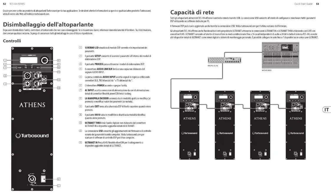 BEFORE AFTER Fig. 1 Fig. 4 Fig. 5 Fig. 6 Fig. 2 Fig. 352 TCS-AN SERIES Quick Start Guide 53 Grazie per aver scelto un prodotto di altoparlanti Turbosound per la tua applicazione. Se desideri ulteriori informazioni su questo o qualsiasi altro prodotto Turbosound, visita il nostro sito Web all'indirizzo turbosound.com. Disimballaggio dell'altoparlante Dopo aver disimballato l'unità, controllare attentamente che non siano danneggiate. Se si riscontrano danni, informare immediatamente il fornitore. Tu, il destinatario, devi avviare qualsiasi reclamo. Si prega di conservare tutti gli imballaggi in caso di futura rispedizione. Controlli (1) SCHERMO LCD visualizza il modulo DSP corrente e le impostazioni dei parametri. (2) Il pulsante SETUP consente di scorrere i parametri all'interno dei moduli di elaborazione DSP. (3) Il pulsante PROCESS passa attraverso i moduli di elaborazione DSP. (4) Il connettore AUDIO LINK XLR fornisce una copia non elaborata del segnale AUDIO INPUT. (5) La presa combinata AUDIO INPUT accetta segnali in ingresso utilizzando connettori XLR, TRS bilanciati da " o TS sbilanciati da ". (6) L'interruttore POWER accende e spegne l'unità. (7) AC INPUT accetta connessioni di alimentazione da cavi di alimentazione dotati di connettori Neutrik powerCON twist-locking. (8) LA MANOPOLA ENCODER commuta tra le modalità graca e modica (se premuta) e modica i valori dei parametri (se ruotata). (9) Il pulsante EXIT torna alla schermata DSP di livello superiore quando viene premuto. (10) Il pulsante INVIO salva le modiche e disattiva la modalità Modica quando viene premuto. (11) ULTRANET THRU invia l'audio digitale non elaborato dal connettore ULTRANET IN a dispositivi aggiuntivi dotati di ULTRANET. (12) La connessione USB consente gli aggiornamenti del rmware e il controllo remoto dei parametri tramite computer. Visita turbosound.com per scaricare il software di controllo DSP per il tuo computer. (13) ULTRANET IN Presa RJ45/Neutrik etherCON per il collegamento a dispositivi aggiuntivi dotati di ULTRANET. (6) (7) (9) (10) (11) (13) (8) (1) (2) (3) (4) (5) (12) Capacità di rete Tutti gli altoparlanti alimentati TCS-AN orono il controllo remoto tramite USB. La connessione USB consente all'utente di congurare e monitorare tutti i parametri DSP utilizzando un software dedicato per PC. Il rmware DSP può essere aggiornato anche tramite la connessione USB. Visita turbosound.com per l'ultima versione del rmware. Gli altoparlanti TCS-AN orono anche funzionalità di rete proprietarie ULTRANET attraverso le connessioni ULTRANET IN e ULTRANET THRU utilizzando cavi CAT5 con connettori RJ45. ULTRANET consente all'utente di trasmettere in modo unidirezionale no a 16 canali indipendenti di audio a 24 bit in tutto il sistema TCS-AN, nonché altri dispositivi dotati di ULTRANET come mixer digitali e sistemi di monitoraggio personale. È possibile collegare in serie no a 7 dispositivi su un unico cavo ULTRANET. MIDAS M32MIDAS DL1654 TCS-AN SERIES Quick Start Guide 55 Struttura del menu TCS-AN DSP Gamma completa Subwoofer Funzione PROCESSI EQ Nessuno Nessuno Imposta la risposta in frequenza all'impostazione predenita. Array2 – Imposta una risposta in frequenza corretta per 2 cabinet disposti insieme. Array3 – Imposta una risposta in frequenza corretta per 3 o più cabinet disposti insieme. Utente Utente Consente di denire la propria impostazione della risposta in frequenza accedendo al sottomenu corrispondente. Sottomenu Scaalature basse/alte Scaalature basse/alte Consente di denire un ltro shelving basso e alto. Parametrico 1 e 2 Parametrico 1 e 2 Consente di denire un equalizzatore parametrico di tipo campana (Frequency, Qual. and Gain). XOVER Nessuno – L'unità è impostata per la riproduzione a gamma intera predenita. HP 100 Hz LP 100 Hz Preimpostato con ltro 100 Hz, 24 dB/ottava per il crossover tra subwoofer e altoparlanti full range. HP 120Hz LP 120 Hz Preimpostato con ltro 120 Hz, 24 dB/ottava per il crossover tra subwoofer e altoparlanti full range. Utente Utente Sottomenu utente crossover per la combinazione con altri sistemi di altoparlanti full-range o subwoofer Sottomenu frequenza frequenza Seleziona la frequenza di crossover desiderata: