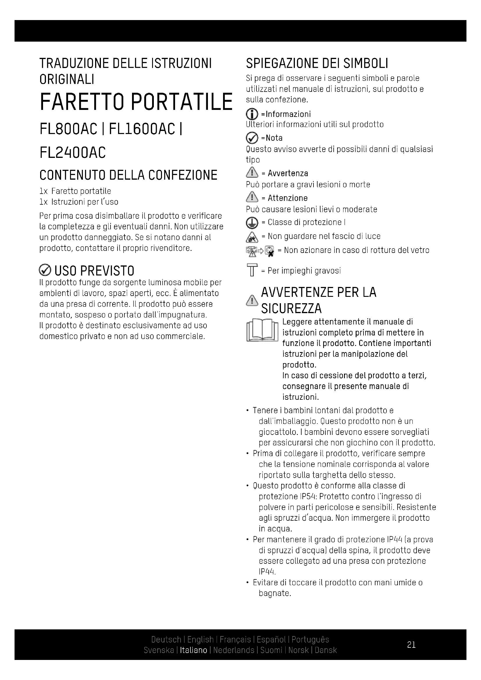 0279: FL2400AC Tensione di alimentazione 230 V~, 50/60 Hz Potenza in watt 10 W 20 W 30 W Protezione IP IP54 (resistente agli spruzzi d’acqua) Protezione IK IK05 Protezione IP (spina) IP44 (resistente agli spruzzi d’acqua) Classe di protezione