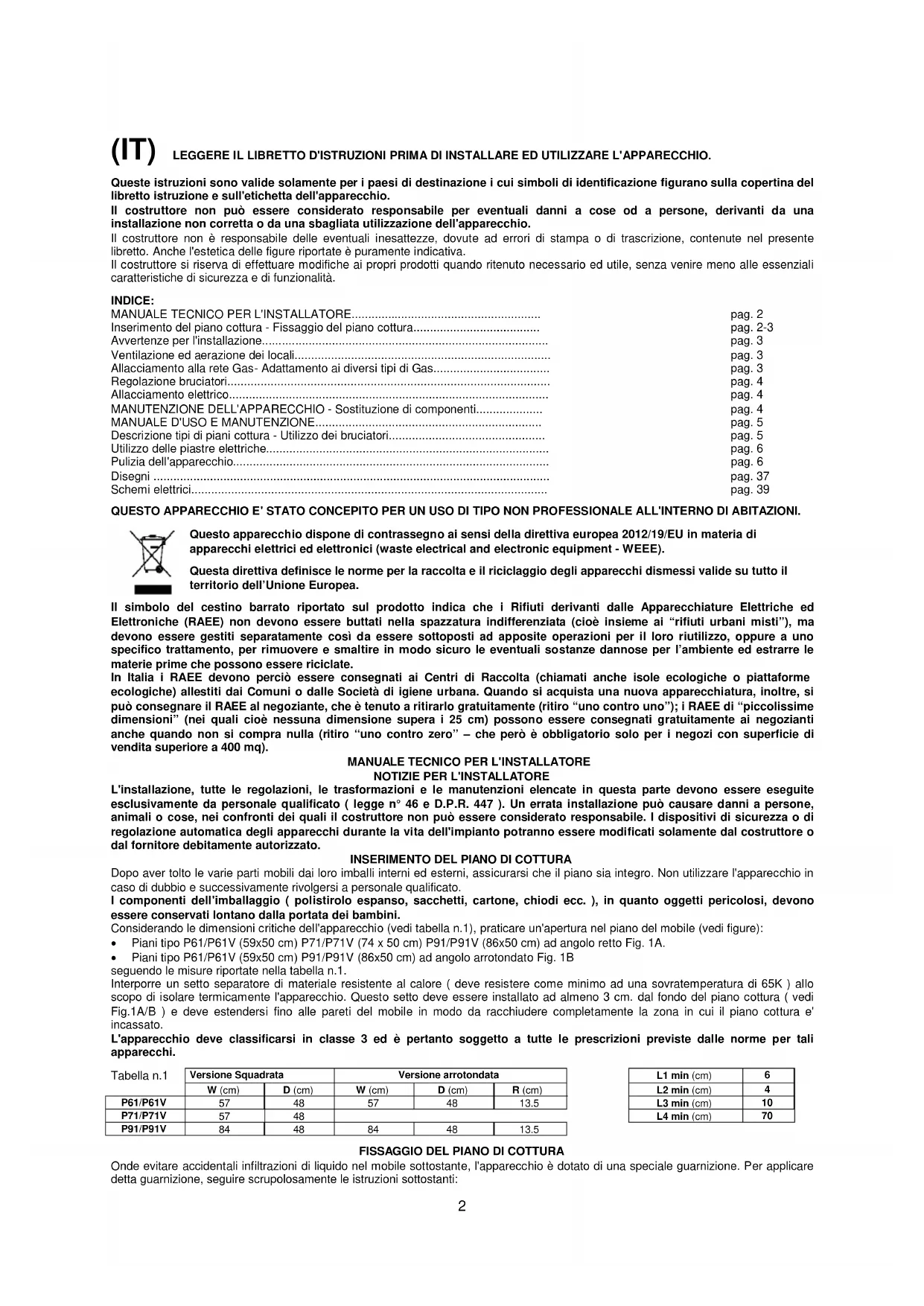 seite. 22 FÜR EINBAUKOCHFLÄCHEN MIT GASBETRIEB UND GEMISCHTEM BETRIEB 59X50 cm (TYP P61/P61V) 74X50 cm (TYP P71/P71V) 86X50 cm (TYP P91/P91V) (NL) INSTRUCTIES VOOR DE INSTALLATIE, HET ONDERHOUD EN pag. 27 HET GEBRUIK VAN GAS- EN GEMENGDE INBOUWKOOKVLAKKEN 59X50 cm (MODEL P61/P61V) 74X50 cm (MODEL P71/P71V) 86X50 cm (MODEL P91/P91V) (BE) HANDBOEKJE MET INSTRUCTIES VOOR DE INSTALLATIE, pag. 32 HET ONDERHOUD EN HET GEBRUIK VAN GAS- EN GEMENGDE INBOUWKOOKVLAKKEN 59X50 cm (MODEL P61/P61V) 74X50 cm (MODEL P71/P71V) 86x50 cm (MODEL P91/P91V) P/D4 P/D42 (IT) LEGGERE IL LIBRETTO D'ISTRUZIONI PRIMA DI INSTALLARE ED UTILIZZARE L'APPARECCHIO. Queste istruzioni sono valide solamente per i paesi di destinazione i cui simboli di identificazione figurano sulla copertina del libretto istruzione e sull'etichetta dell'apparecchio. Il costruttore non può essere considerato responsabile per eventuali danni a cose od a persone, derivanti da una installazione non corretta o da una sbagliata utilizzazione dell'apparecchio. Il costruttore non è responsabile delle eventuali inesattezze, dovute ad errori di stampa o di trascrizione, contenute nel presente libretto. Anche l'estetica delle figure riportate è puramente indicativa. Il costruttore si riserva di effettuare modifiche ai propri prodotti quando ritenuto necessario ed utile, senza venire meno alle essenziali caratteristiche di sicurezza e di funzionalità. INDICE: MANUALE TECNICO PER L'INSTALLATORE......................................................... pag. 2 Inserimento del piano cottura - Fissaggio del piano cottura...................................... pag. 2-3 Avvertenze per l'installazione...................................................................................... pag. 3 Ventilazione ed aerazione dei locali............................................................................. pag. 3 Allacciamento alla rete Gas- Adattamento ai diversi tipi di Gas................................... pag. 3 Regolazione bruciatori................................................................................................. pag. 4 Allacciamento elettrico................................................................................................ pag. 4 MANUTENZIONE DELL'APPARECCHIO - Sostituzione di componenti.................... pag. 4 MANUALE D'USO E MANUTENZIONE.................................................................... pag. 5 Descrizione tipi di piani cottura - Utilizzo dei bruciatori............................................... pag. 5 Utilizzo delle piastre elettriche..................................................................................... pag. 6 Pulizia dell'apparecchio............................................................................................... pag. 6 Disegni ....................................................................................................................... pag. 37 Schemi elettrici........................................................................................................... pag. 39 QUESTO APPARECCHIO E' STATO CONCEPITO PER UN USO DI TIPO NON PROFESSIONALE ALL'INTERNO DI ABITAZIONI. Questo apparecchio dispone di contrassegno ai sensi della direttiva europea 2012/19/EU in materia di apparecchi elettrici ed elettronici (waste electrical and electronic equipment - WEEE). Questa direttiva definisce le norme per la raccolta e il riciclaggio degli apparecchi dismessi valide su tutto il territorio dell’Unione Europea. Il simbolo del cestino barrato riportato sul prodotto indica che i Rifiuti derivanti dalle Apparecchiature Elettriche ed Elettroniche (RAEE) non devono essere buttati nella spazzatura indifferenziata (cioè insieme ai “rifiuti urbani misti”), ma devono essere gestiti separatamente così da essere sottoposti ad apposite operazioni per il loro riutilizzo, oppure a uno specifico trattamento, per rimuovere e smaltire in modo sicuro le eventuali sostanze dannose per l’ambiente ed estrarre le materie prime che possono essere riciclate. In Italia i RAEE devono perciò essere consegnati ai Centri di Raccolta (chiamati anche isole ecologiche o piattaforme ecologiche) allestiti dai Comuni o dalle Società di igiene urbana. Quando si acquista una nuova apparecchiatura, inoltre, si può consegnare il RAEE al negoziante, che è tenuto a ritirarlo gratuitamente (ritiro “uno contro uno”); i RAEE di “piccolissime dimensioni” (nei quali cioè nessuna dimensione supera i 25 cm) possono essere consegnati gratuitamente ai negozianti anche quando non si compra nulla (ritiro “uno contro zero” – che però è obbligatorio solo per i negozi con superficie di vendita superiore a 400 mq).