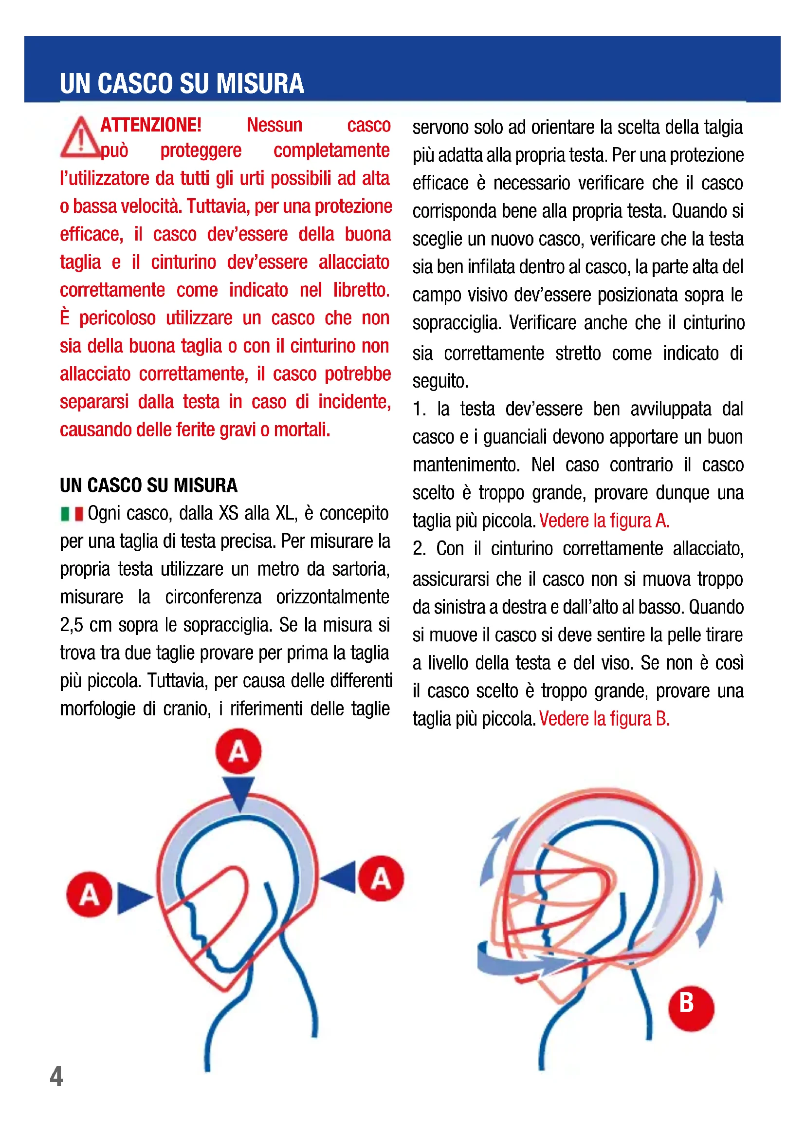 casco e i guanciali devono apportare un buon mantenimento. Nel caso contrario il casco scelto è troppo grande, provare dunque una taglia più piccola. Vedere la figura A.