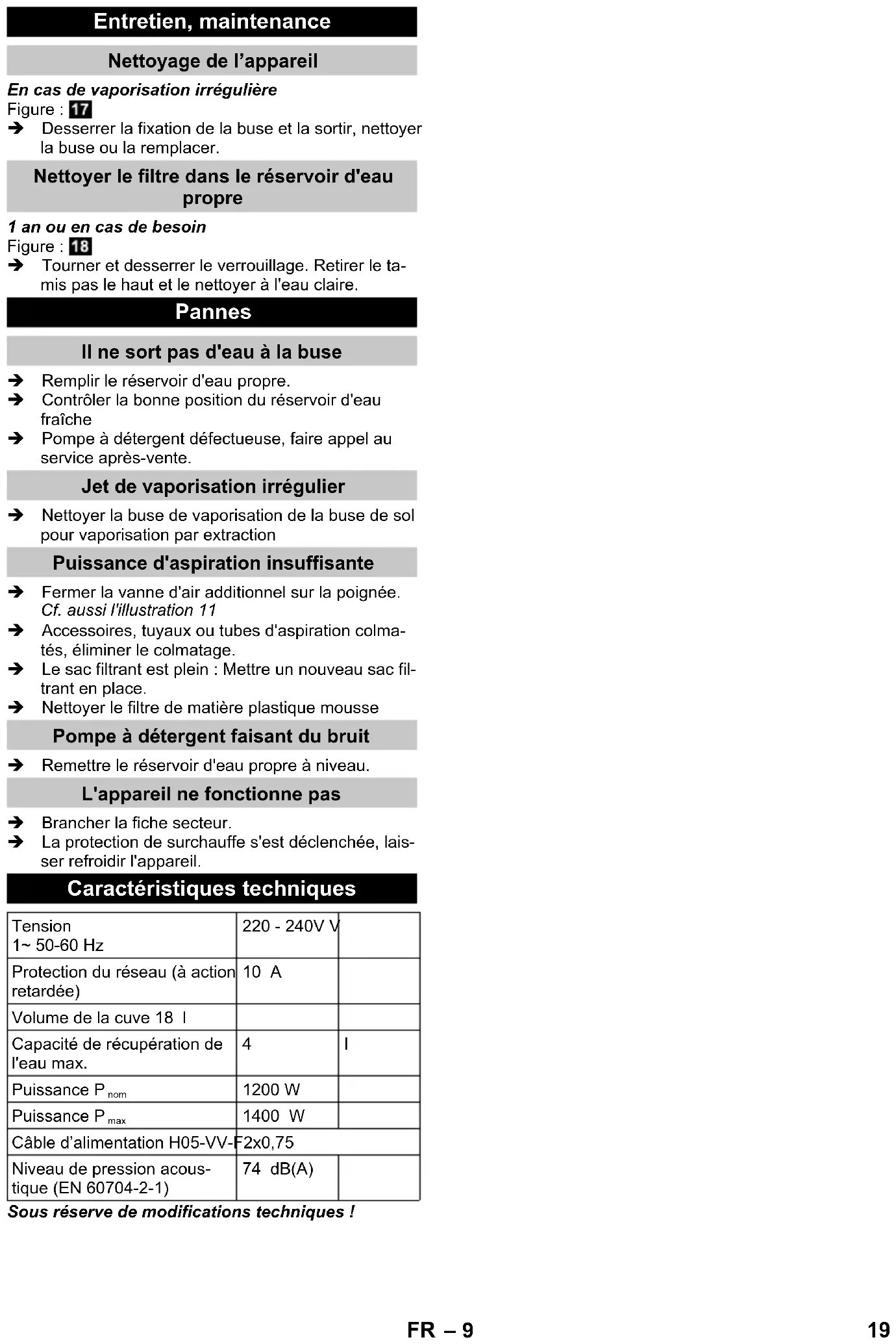 Pulizia ad umido di tappeti/superfici dure Pulizia ad umido di moquette Pulizia ad umido di pavimenti duri Riempire il serbatoio dell'acqua pulita Iniziare a lavorare Svuotare il contenitore durante il lavoro Suggerimenti per la pulizia/Modalità di lavoro 22 IT– 8 – Operare sempre dalla superficie pulita verso la su- perficie sporca. – Le moquette con un fondo di juta in caso di inter- venti troppo umidi possono contrarsi e scolorirsi. – Spazzolare i tappeti a pelo lungo dopo la pulizia quando sono ancora bagnati in direzione del pelo (ad es. con una spazzola per peli o uno strofinac- cio). – Una impregnatura con Care Tex RM 762 dopo la pulizia ad umido previene che il rivestimento tessile si possa sporcare subito. – Percorre la superficie trattata o posizionarvi dei mobili solo dopo l'asciugatura per prevenire che si possano formare impronte o macchie di ruggine. Attivare aspirazione e nebulizzazione (Posizione I). Spruzzare ed aspirare contemporaneamente la so- luzione detergente in un solo passaggio. Successivamente spegnere l'interruttore per spruzzare ed aspirare i resti della soluzione deter- gente. Dopo la pulizia pulire nuovamente i tappeti con ac- qua pulita e calda ed impregnare all'occorrenza. Accendere la nebulizzazione (Posizione I). Applicare la soluzione detergente e far agire per al- meno 5 minuti (aspirazione disattivata). Quindi pulire la superficie come nel caso di sporco leggero / normale. Dopo la pulizia pulire nuovamente i tappeti con ac- qua pulita e calda ed impregnare all'occorrenza. Lavare i tubi di spruzzatura nell’apparecchio, a tal fine: Riempire il serbatoio del detergente con ca.1 litro di acqua pulita. Tenere la bocchetta sopra lo scolo e accendere la pompa di spruzzatura finché l’acqua è uscita tutta. Indicazione Per utilizzare l'apparecchio come aspiratore multiuso è possibile rimuovere il manico di spruzzo e il tubo flessi- bile di nebulizzazione. Figura Togliere i tubi di nebulizzazione e le clip di fissaggio dai tubi di aspirazione. Premere i due nasi di aggancio laterali e rimuovere la maniglia di nebulizzazione dal manico. ATTENZIONE Per l'aspirazione a secco, lavorare sempre con sacchet- to filtro inserito. È possibile ottenere un filtraggio migliore per mezzo di un filtro a cartuccia (accessori speciali). Il contenitore e gli accessori devono essere asciutti, al- trimenti lo sporco s'incolla. Scegliere l'accessorio desiderato e introdurlo sui tubi di aspirazione o direttamente sulla maniglia. Figura Inserire il sacchetto filtro. Scegliere l'accessorio desiderato e introdurlo sui tubi di aspirazione o direttamente sulla maniglia. Accendere l'aspirazione (Posizione I). inserire l'inserto per pavimenti duri nella bocchetta per pavimenti. Le spazzole devono essere rivolte in avanti. Usare l'aspiratore senza inserto per superfici dure. Figura Per l'adattamento della forza di aspirazione aziona- re il cursore per l'aria secondaria. Nota: Richiudere il cursore dell'aria secondaria dopo l'uso! ATTENZIONE Non utilizzare il sacchetto filtrante! Indicazione: Se il serbatoio è pieno, un galleggiante chiude l'apertura di aspirazione e l'apparecchio gira con maggiore velocità. Spegnere subito l'apparecchio e svuotare il serbatoio. Per aspirare l'umidità o liquidi montare l'accessorio sul tubo di aspirazione o direttamente sulla mani- glia. Accendere l'aspirazione (Posizione I). Figura Aprire il cursore per l'aria secondaria, quando si aspirano grandi quantità di acqua. Richiudere il cursore dopo l'uso. Svuotare il contenitore pieno (vedi capitolo "Svuo- tare il contenitore“). Spegnere l’apparecchio. Svuotare il contenitore pieno (vedi capitolo "Svuo- tare il contenitore“). Sciacquare accuratamente il contenitore con ac- qua pulita. Dopo ogni uso scollegare gli accessori dall'appa- recchio, con tubo flessibile, bocchetta e prolunghe. Nota: potrebbe ancora fuoriuscire dell'acqua resi- dua, pertanto posizionare nella doccia o la vasca da bagno. Sciacquare gli accessori sotto acqua corrente e successivamente asciugare. Pulire il filtro in materiale espanso sotto l'acqua cor- rente e lasciarlo asciugare a fondo prima di inserir- lo di nuovo. Lasciare aperto l'apparecchio per asciugarlo. Conservare l’apparecchio. Conservare gli acces- sori nell’apparecchio ed in luoghi asciutti. In caso di getto irregolare. Figura Allentare il fissaggio della bocchetta ed estrarla, quindi pulire o sostituila. 1 x anno, o secondo necessità. Figura Ruotare e sbloccare il dispositivo di chiusura. Estrarre il filtro verso l'alto e pulirlo con acqua puli- ta. Metodi di pulizia Sporco leggero / normale Sporco intenso o macchie Terminare la pulizia ad umido Impiego come aspiratore multiuso Aspirazione di pavimenti duri Aspirazione di moquette Aspirazione dell'acqua Messa fuori servizio Cura e manutenzione Pulizia dell’apparecchio Pulire il filtro nel serbatoio dell'acqua pulita 23IT– 9 Riempire il serbatoio dell'acqua pulita. Accertarsi che il serbatoio dell'acqua pulita sia po- sizionato correttamente. Pompa del detergente difettosa, contattare il servi- zio clienti. Pulire la bocchetta della bocchetta di spruzzo per pavimenti. Chiudere il cursore dell'aria secondaria sulla mani- glia. Vedere anche Figura 11 Accessori, tubo flessibile di aspirazione o tubo rigi- do di aspirazione otturati, si prega di eliminare le ot- turazioni. Saccetto filtro pieno: inserire un nuovo sacchetto filtro. Pulire il filtro in materiale espanso. Aggiungere acqua nel serbatoio dell'acqua pulita. Inserire la spina di alimentazione. E' scattata la protezione da surriscaldamento, far raffreddare l'apparecchio. Con riserva di modifiche tecniche! Guasti Nessuna fuoriuscita di acqua dalla bocchetta Getto di spruzzo irregolare Potenza di aspirazione insufficiente Pompa del detergente rumorosa L'apparecchio non funziona Dati tecnici Tensione 1~ 50-60 Hz