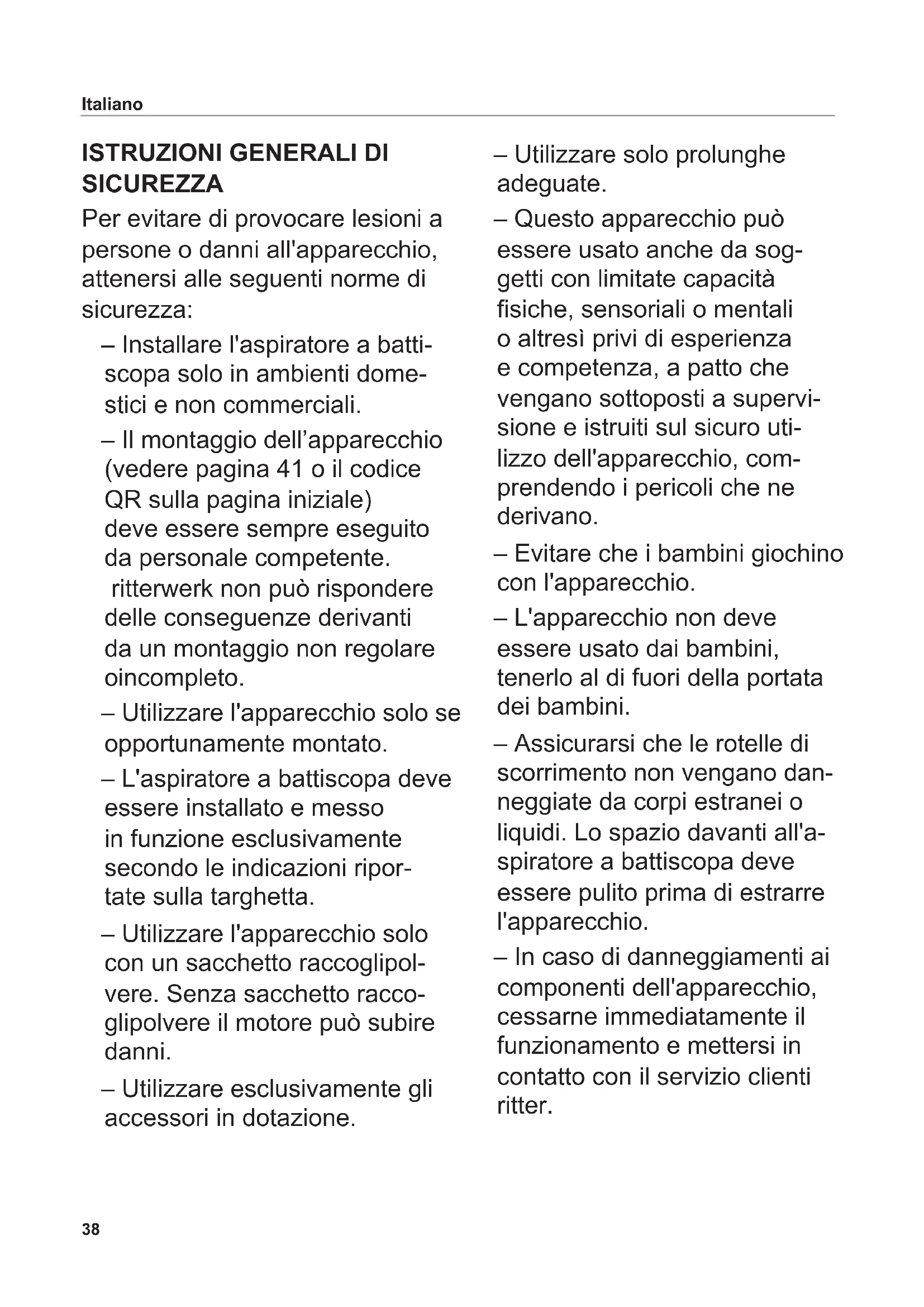 SICUREZZA Per evitare di provocare lesioni a persone o danni all'apparecchio, attenersi alle seguenti norme di sicurezza: – Installare l'aspiratore a batti- scopa solo in ambienti dome- stici e non commerciali. – Il montaggio dell’apparecchio (vedere pagina 41 o il codice QR sulla pagina iniziale) deve essere sempre eseguito da personale competente. ritterwerk non può rispondere delle conseguenze derivanti da un montaggio non regolare o incompleto. – Utilizzare l'apparecchio solo se opportunamente montato. – L'aspiratore a battiscopa deve essere installato e messo in funzione esclusivamente secondo le indicazioni ripor- tate sulla targhetta. – Utilizzare l'apparecchio solo con un sacchetto raccoglipol- vere. Senza sacchetto racco- glipolvere il motore può subire danni. – Utilizzare esclusivamente gli accessori in dotazione. – Utilizzare solo prolunghe adeguate. – Questo apparecchio può essere usato anche da sog- getti con limitate capacità siche, sensoriali o mentali o altresì privi di esperienza e competenza, a patto che vengano sottoposti a supervi- sione e istruiti sul sicuro uti- lizzo dell'apparecchio, com- prendendo i pericoli che ne derivano. – Evitare che i bambini giochino con l'apparecchio. – L'apparecchio non deve essere usato dai bambini, tenerlo al di fuori della portata dei bambini. – Assicurarsi che le rotelle di scorrimento non vengano dan- neggiate da corpi estranei o liquidi. Lo spazio davanti all'a- spiratore a battiscopa deve essere pulito prima di estrarre l'apparecchio. – In caso di danneggiamenti ai componenti dell'apparecchio, cessarne immediatamente il funzionamento e mettersi in contatto con il servizio clienti ritter.39 Italiano – Se durante l'uso si rilevano rumori anomali, odori, fumo o altri errori, staccare la spina di alimentazione se possibile o spegnere l'interruttore di sicurezza. – Non riparare l'apparecchio autonomamente. Se il sigillo sull'alloggiamento del motore risulta danneggiato, la garan- zia decade irrevocabilmente. Pericolo di lesioni – Non salire mai sull'apparec- chio, quando estratto dal suo alloggiamento. – L'apparecchio estratto dal suo alloggiamento rappresenta un pericolo di inciampo. – Non aprire mai il vano motore quando l'apparecchio è in funzione.40 Italiano Leggere attentamente le istru- zioni prima di mettere in funzione l'apparecchio. Conservare le istruzioni e, in caso di cessione dell'apparecchio, consegnarle al nuovo proprietario. Sono tuttavia sempre disponibili istruzioni d'uso aggiornate nel sito www.ritterwerk.de. UTILIZZO PREVISTO L'aspiratore a battiscopa incassato viene utilizzato per rimuovere rapidamente briciole e polvere in cucina. L'utilizzo improprio o errato può causare gravi lesioni personali o danni all'apparecchio. In questi casi la garanzia perde la validità e l'azienda declina ogni forma di responsabilità. ASPIRAZIONE