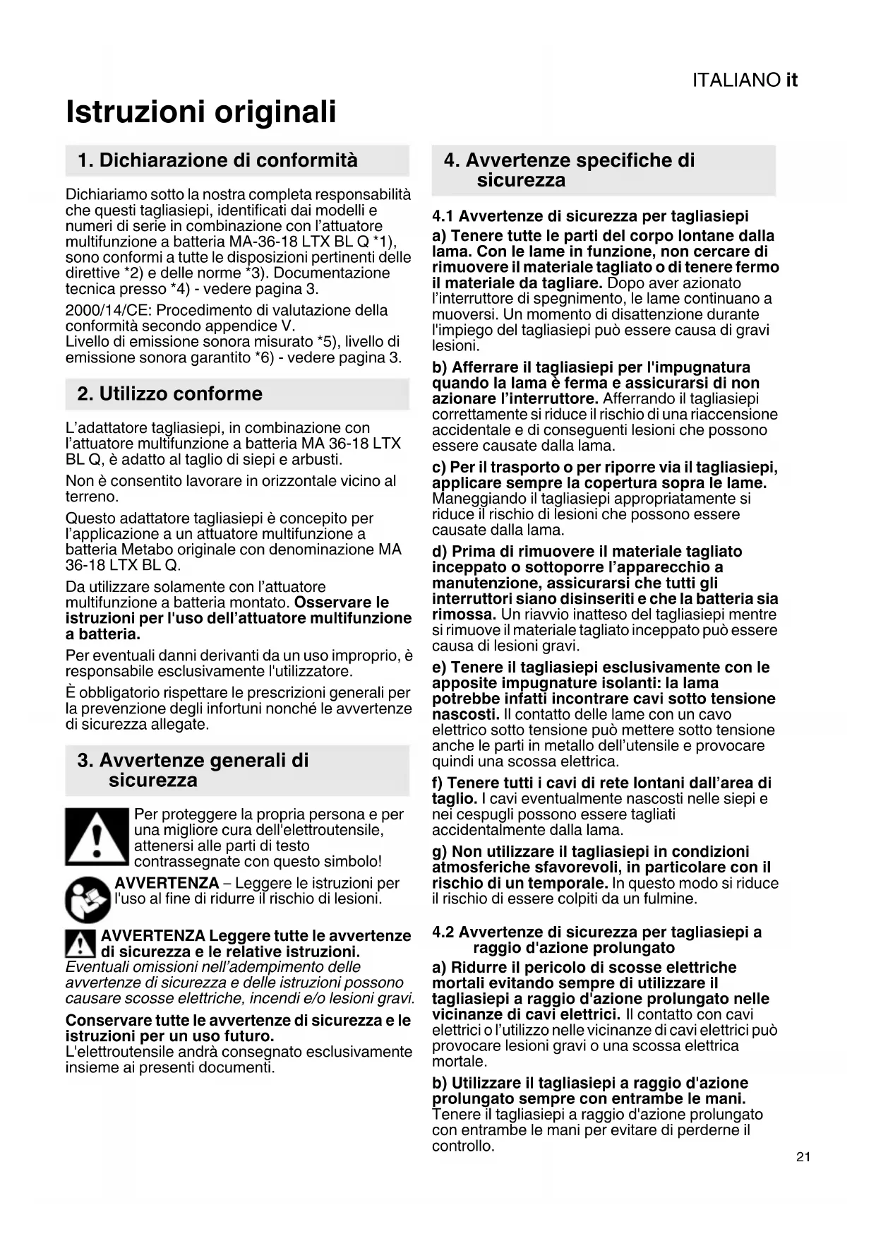 Istruzioni originali Dichiariamo sotto la nostra completa responsabilità che questi tagliasiepi, identificati dai modelli e numeri di serie in combinazione con l’attuatore multifunzione a batteria MA-36-18 LTX BL Q *1), sono conformi a tutte le disposizioni pertinenti delle direttive *2) e delle norme *3). Documentazione tecnica presso *4) - vedere pagina 3. 2000/14/CE: Procedimento di valutazione della conformità secondo appendice V. Livello di emissione sonora misurato *5), livello di emissione sonora garantito *6) - vedere pagina 3. L’adattatore tagliasiepi, in combinazione con l’attuatore multifunzione a batteria MA 36-18 LTX BL Q, è adatto al taglio di siepi e arbusti. Non è consentito lavorare in orizzontale vicino al terreno. Questo adattatore tagliasiepi è concepito per l’applicazione a un attuatore multifunzione a batteria Metabo originale con denominazione MA 36-18 LTX BL Q. Da utilizzare solamente con l’attuatore multifunzione a batteria montato. Osservare le istruzioni per l'uso dell’attuatore multifunzione a batteria. Per eventuali danni derivanti da un uso improprio, è responsabile esclusivamente l'utilizzatore. È obbligatorio rispettare le prescrizioni generali per la prevenzione degli infortuni nonché le avvertenze di sicurezza allegate. Per proteggere la propria persona e per una migliore cura dell'elettroutensile, attenersi alle parti di testo contrassegnate con questo simbolo! AVVERTENZA – Leggere le istruzioni per l'uso al fine di ridurre il rischio di lesioni. AVVERTENZA Leggere tutte le avvertenze di sicurezza e le relative istruzioni. Eventuali omissioni nell’adempimento delle avvertenze di sicurezza e delle istruzioni possono causare scosse elettriche, incendi e/o lesioni gravi. Conservare tutte le avvertenze di sicurezza e le istruzioni per un uso futuro. L'elettroutensile andrà consegnato esclusivamente insieme ai presenti documenti.