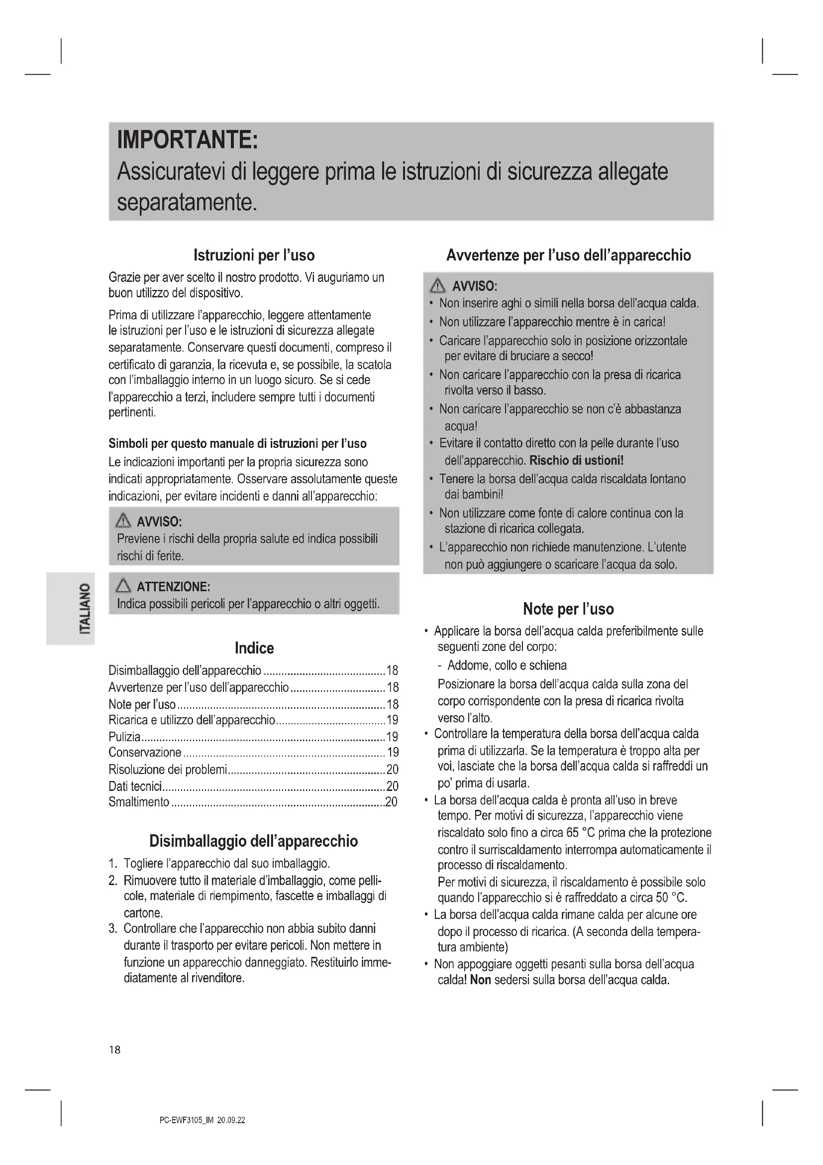 - Non appoggiare oggetti pesanti sulla borsa dell’acqua calda! Non sedersi sulla borsa dell’acqua calda.PC-EWF3105_IM 20.09.22