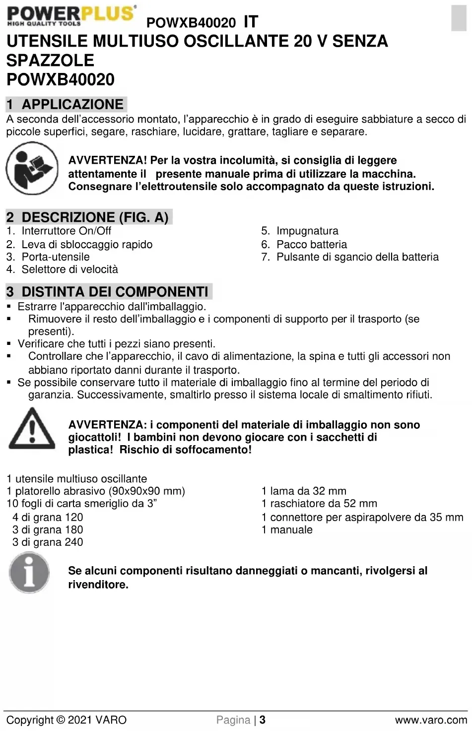 - Se possibile conservare tutto il materiale di imballaggio fino al termine del periodo di garanzia. Successivamente, smaltirlo presso il sistema locale di smaltimento rifiuti. AVVERTENZA: i componenti del materiale di imballaggio non sono giocattoli! I bambini non devono giocare con i sacchetti di plastica! Rischio di soffocamento! 1 utensile multiuso oscillante 1 platorello abrasivo (90x90x90 mm) 10 fogli di carta smeriglio da 3” 4 di grana 120 3 di grana 180 3 di grana 240 1 lama da 32 mm 1 raschiatore da 52 mm 1 connettore per aspirapolvere da 35 mm 1 manuale Se alcuni componenti risultano danneggiati o mancanti, rivolgersi al rivenditore.POWXB40020 IT Copyright © 2021 VARO Pagina | 4 www.varo.com 4 SIMBOLI Nel presente manuale e/o sull’apparecchio sono utilizzati i seguenti simboli: