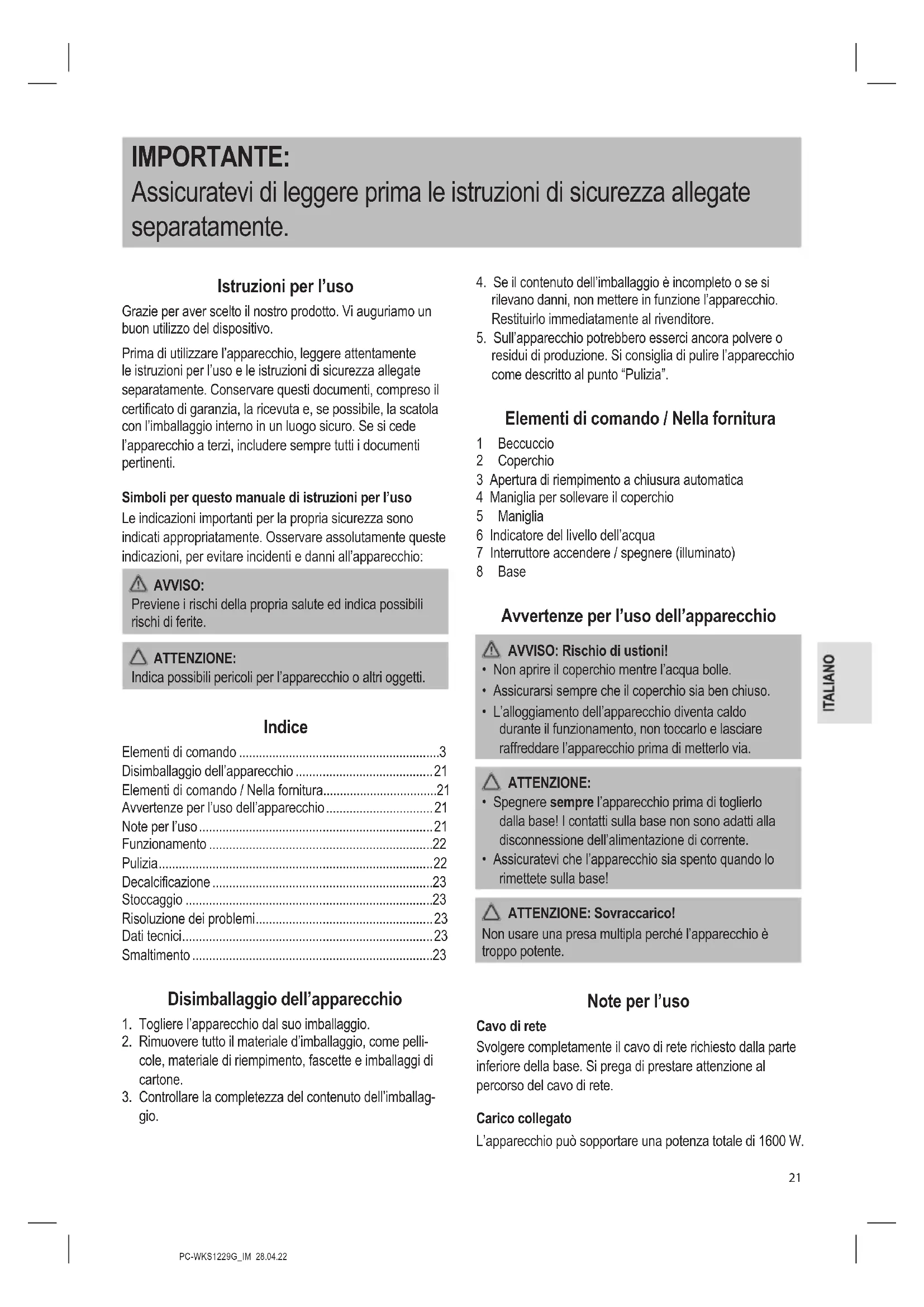 - Assicuratevi che l’apparecchio sia spento quando lo rimettete sulla base! ATTENZIONE: Sovraccarico! Non usare una presa multipla perché l’apparecchio è troppo potente. Note per l’uso Cavo di rete Svolgere completamente il cavo di rete richiesto dalla parte inferiore della base. Si prega di prestare attenzione al percorso del cavo di rete. Carico collegato L’apparecchio può sopportare una potenza totale di 1600 W.PC-WKS1229G_IM 28.04.22