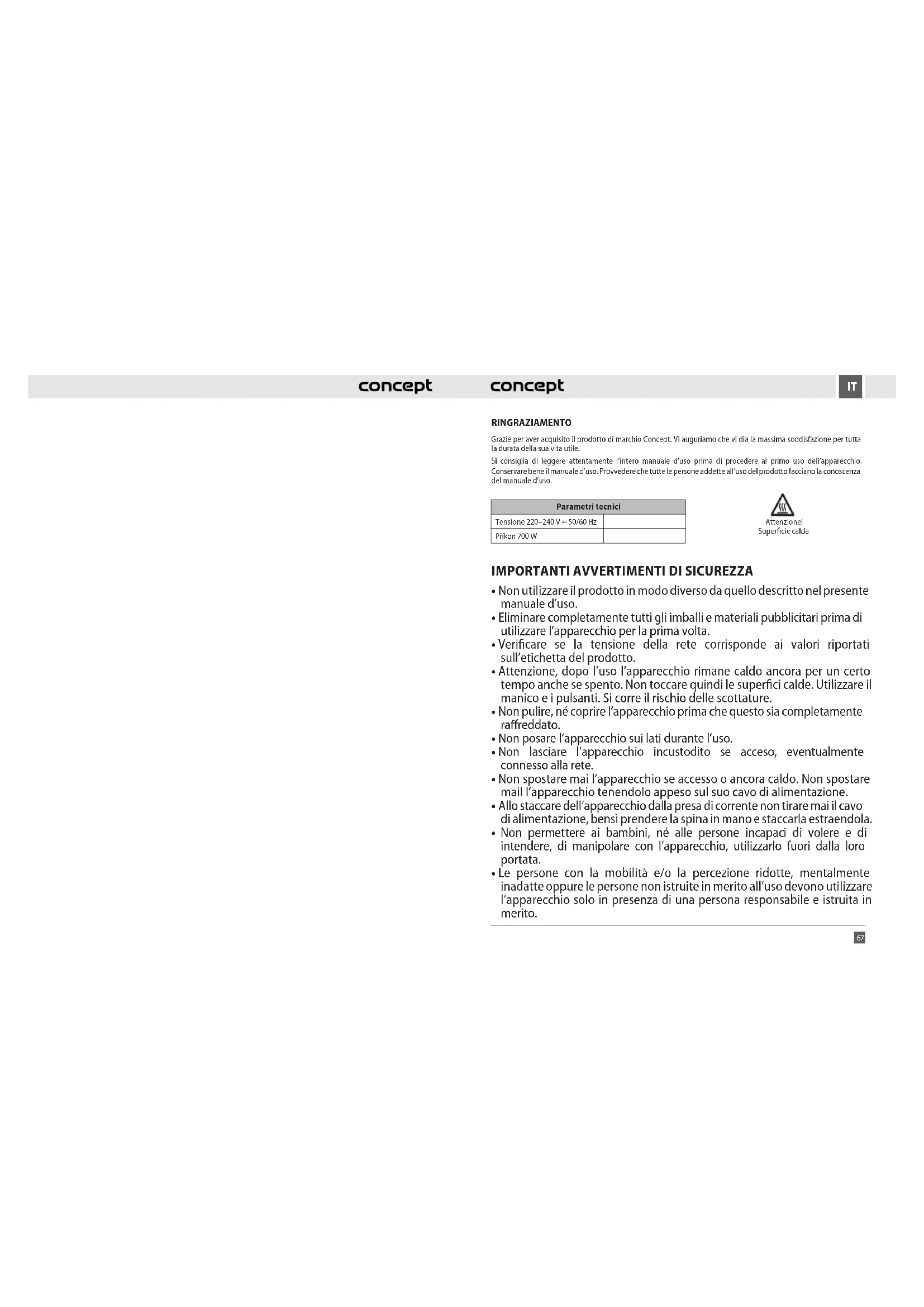 RINGRAZIAMENTO Grazie per aver acquisito il prodotto di marchio Concept. Vi auguriamo che vi dia la massima soddisfazione per tutta la durata della sua vita utile. Si consiglia di leggere attentamente l’intero manuale d’uso prima di procedere al primo uso dell’apparecchio. Conservare bene il manuale d’uso. Provvedere che tutte le persone addette all’uso del prodotto facciano la conoscenza del manuale d’uso. Parametri tecnici Tensione 220–240 V ~ 50/60 Hz Příkon 700 W
