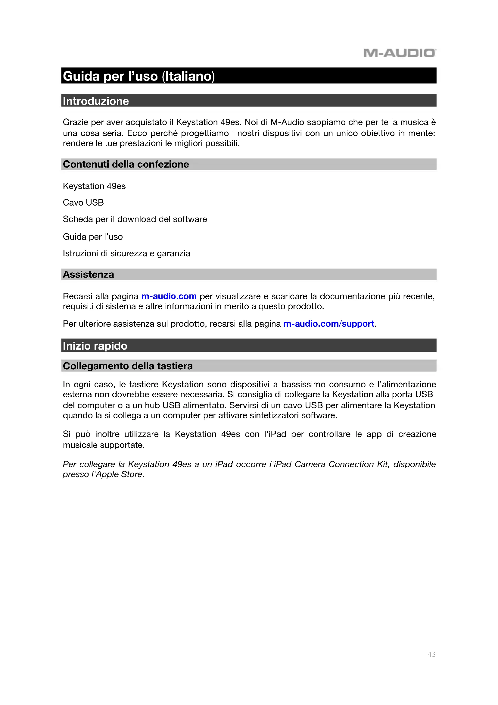 Les paramètres d’usine du clavier sont maintenant réinitialisés.43 Guida per l’uso (Italiano) Introduzione Grazie per aver acquistato il Keystation 49es. Noi di M-Audio sappiamo che per te la musica è una cosa seria. Ecco perché progettiamo i nostri dispositivi con un unico obiettivo in mente: rendere le tue prestazioni le migliori possibili. Contenuti della confezione Keystation 49es Cavo USB Scheda per il download del software Guida per l’uso Istruzioni di sicurezza e garanzia Assistenza Recarsi alla pagina m-audio.com per visualizzare e scaricare la documentazione più recente, requisiti di sistema e altre informazioni in merito a questo prodotto. Per ulteriore assistenza sul prodotto, recarsi alla pagina m-audio.com/support. Inizio rapido Collegamento della tastiera In ogni caso, le tastiere Keystation sono dispositivi a bassissimo consumo e l’alimentazione esterna non dovrebbe essere necessaria. Si consiglia di collegare la Keystation alla porta USB del computer o a un hub USB alimentato. Servirsi di un cavo USB per alimentare la Keystation quando la si collega a un computer per attivare sintetizzatori software. Si può inoltre utilizzare la Keystation 49es con l'iPad per controllare le app di creazione musicale supportate. Per collegare la Keystation 49es a un iPad occorre l'iPad Camera Connection Kit, disponibile presso l'Apple Store.44 Configurazione Elementi non elencati sotto Introduzione > Contenuti della confezione sono venduti separatamente.