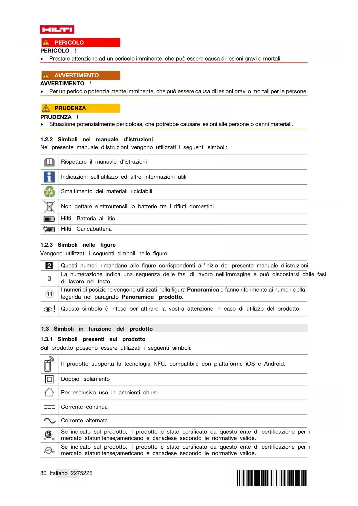 Nel presente manuale d'istruzioni vengono utilizzati i seguenti simboli: Rispettare il manuale d'istruzioni Indicazioni sull'utilizzo ed altre informazioni utili Smaltimento dei materiali riciclabili Non gettare elettroutensili o batterie tra i rifiuti domestici Hilti Batteria al litio Hilti Caricabatteria