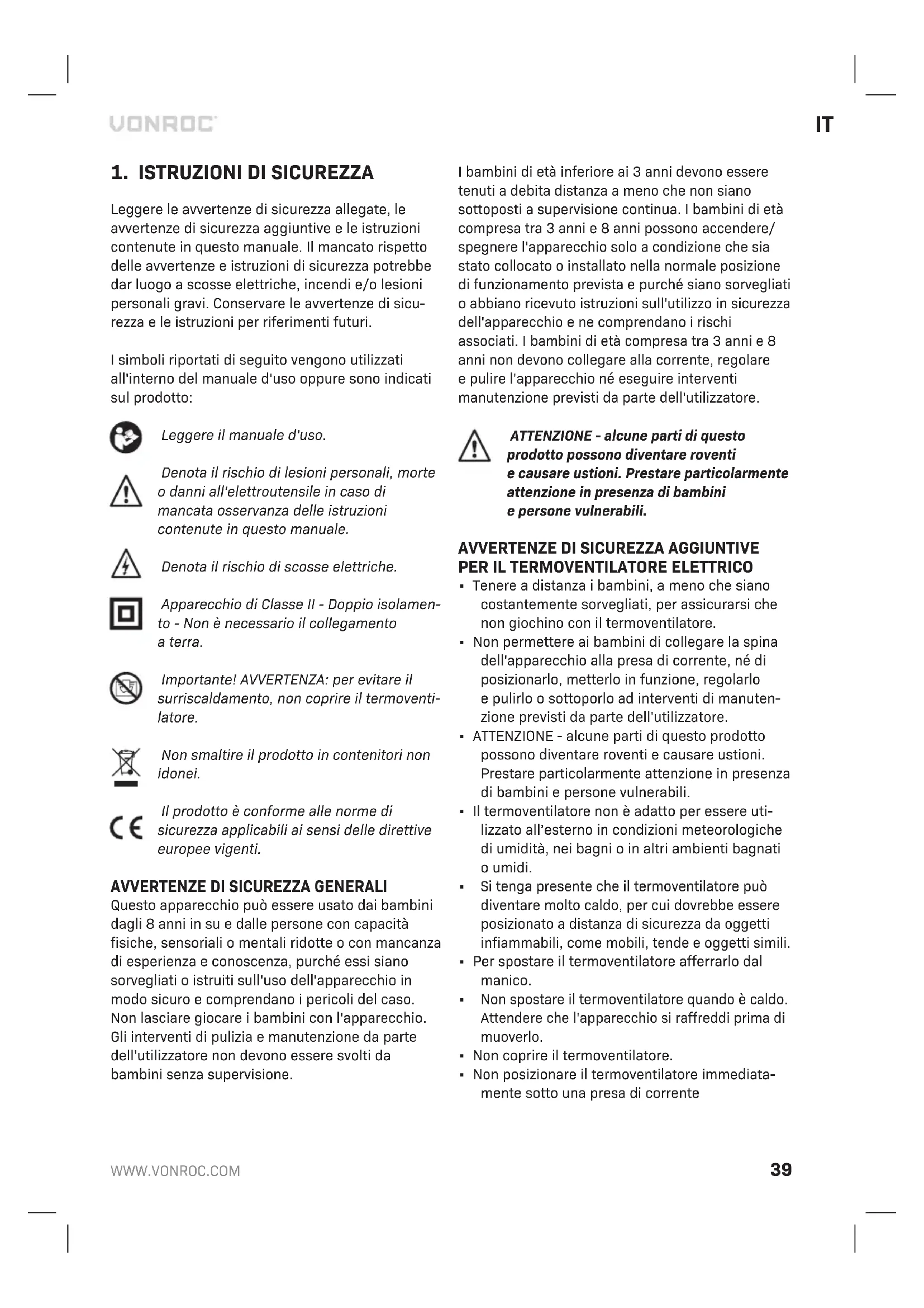 postazione di riscaldamento Girare l’interruttore sull’impostazione di riscaldamento Il termostato èin funzione Attivare il termostato eascoltare se si avverte un rumore di apertura/chiusura. Qualora non sia udibile un clic eil termostato non sia danneggiato, il termoventilatore si accende automaticamente quando l'apparecchio si èraffreddato La protezione termica autori- pristinante èin funzione Spegnere il termoventilatore eispezionare il blocco di ingresso euscita. Staccare la spina ed attendere almeno 10 minuti per il ripristino del sistema di protezione prima di rimettere in funzione il termoventilatore. Rumore eccessivo L’apparecchio non si trova in posizione verticale Collocare il termoventilatore su una superficie piana PROTEZIONE DELL'AMBIENTE Le apparecchiature elettriche oelettroniche difettose e/oscartate devono essere conferite presso gli opportuni siti di riciclaggio. Solo per iPaesi UE Non smaltire gli elettroutensili insieme ai rifiuti domestici. Secondo la Direttiva europea 2012/19/ UE sui rifiuti delle apparecchiature elettriche ed elettroniche ela relativa implementazione nelle normative locali, gli elettroutensili ormai inutilizza- bili devono essere raccolti separatamente esmaltiti in modo ecologico. GARANZIA Iprodotti VONROC sono sviluppati secondo gli stan- dard di qualità più elevati esono garantiti esenti da difetti, sia per quanto riguarda imateriali che la lavorazione, per il periodo stabilito per legge ade- correre dalla data di acquisto iniziale. Se durante questo periodo il prodotto dovesse presentare dei difetti di materiali e/odi lavorazione, contattare di- rettamente VONROC. Le seguenti circostanze sono escluse dalla garanzia: Le seguenti circostanze sono escluse dalla garanzia: