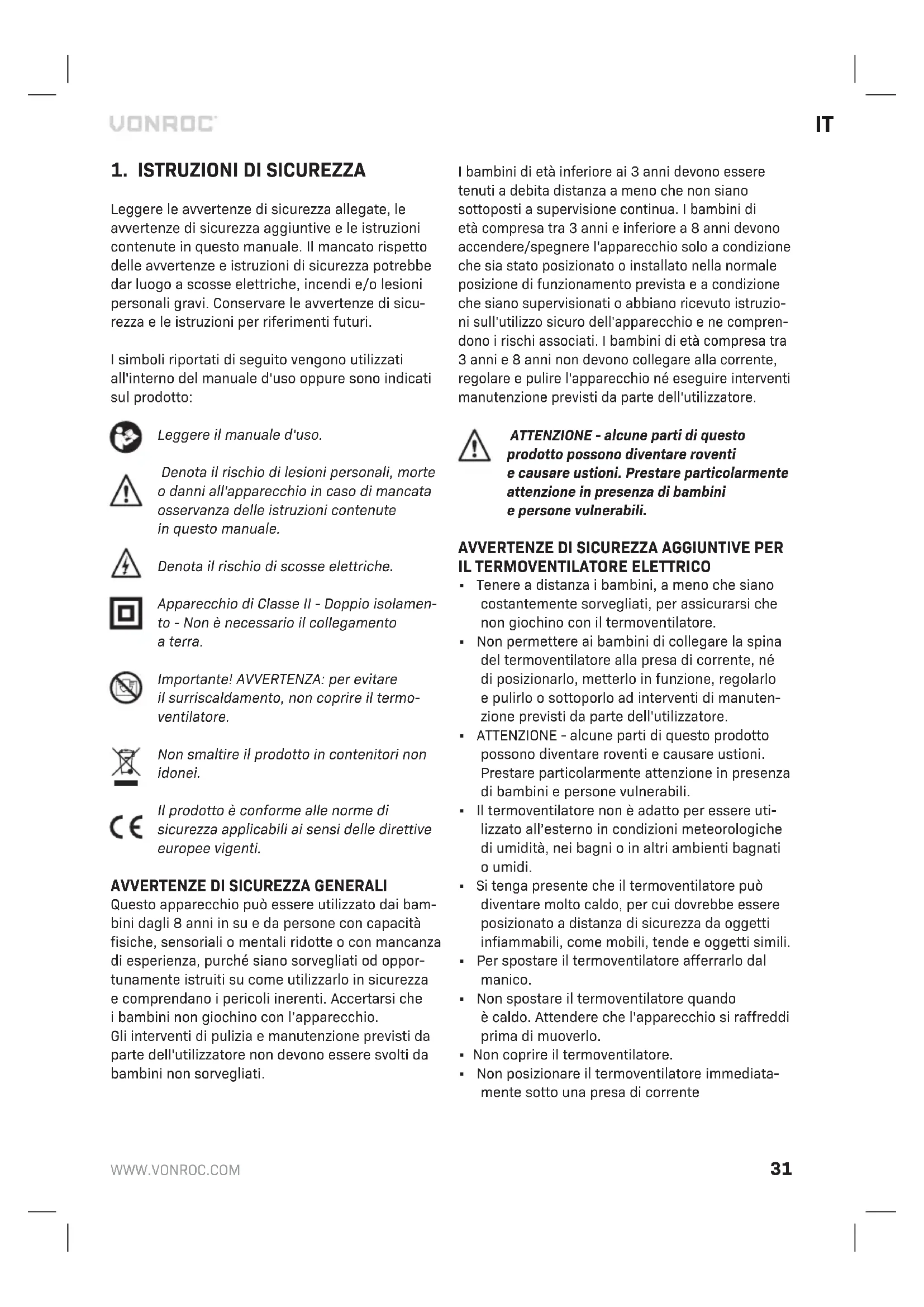 Leggere le avvertenze di sicurezza allegate, le avvertenze di sicurezza aggiuntive e le istruzioni contenute in questo manuale. Il mancato rispetto delle avvertenze e istruzioni di sicurezza potrebbe dar luogo a scosse elettriche, incendi e/o lesioni personali gravi. Conservare le avvertenze di sicu- rezza e le istruzioni per riferimenti futuri. I simboli riportati di seguito vengono utilizzati all'interno del manuale d'uso oppure sono indicati sul prodotto: Leggere il manuale d'uso. Denota il rischio di lesioni personali, morte o danni all'apparecchio in caso di mancata osservanza delle istruzioni contenute inquesto manuale. Denota il rischio di scosse elettriche. Apparecchio di Classe II - Doppio isolamen- to - Non è necessario il collegamento aterra. Importante! AVVERTENZA: per evitare ilsurriscaldamento, non coprire il termo- ventilatore. Non smaltire il prodotto in contenitori non idonei. Il prodotto è conforme alle norme di sicurezza applicabili ai sensi delle direttive europee vigenti.