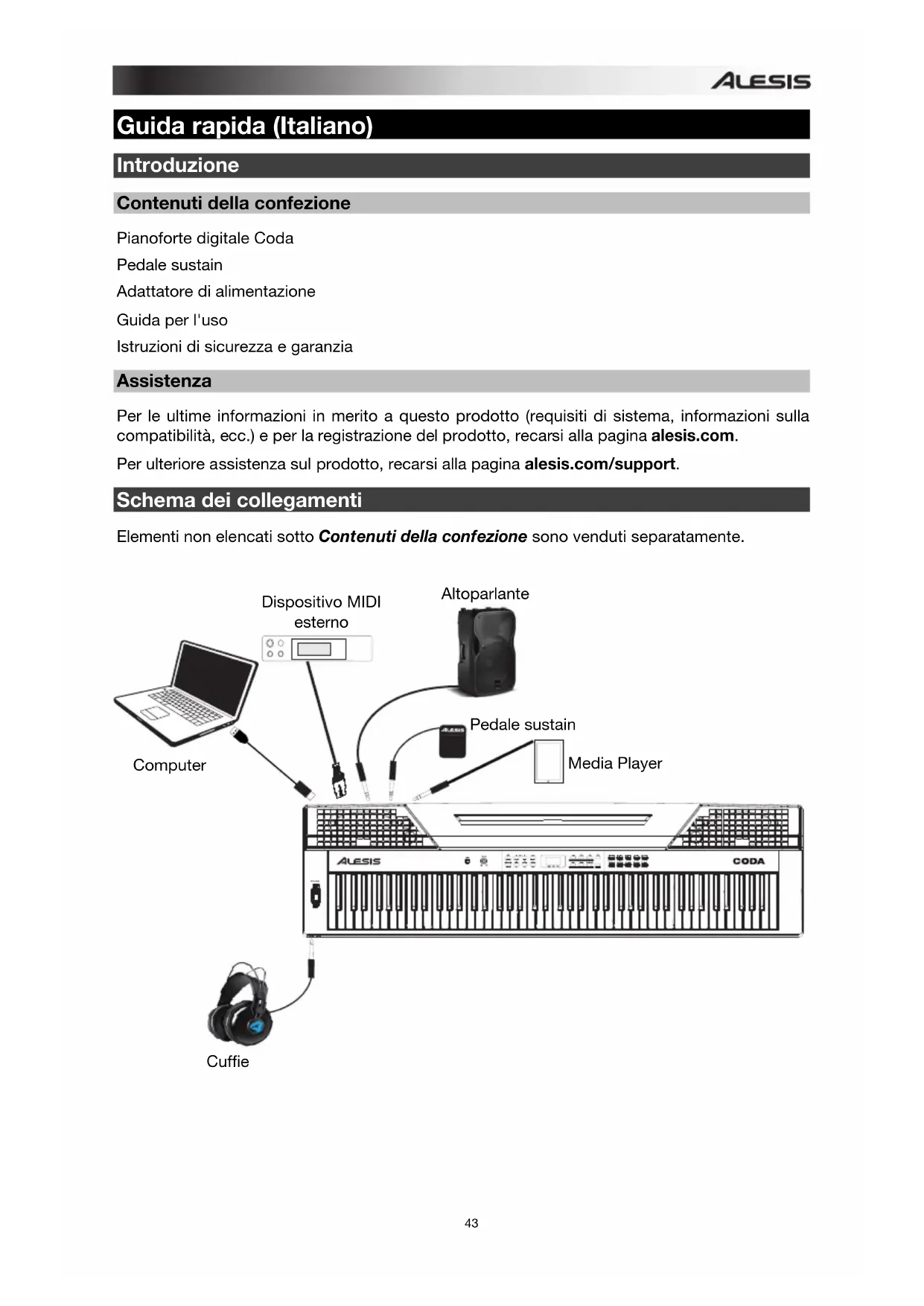 Paramètre Type de système d’accord 1 Pythagorean 2 Pure Major 3 Pure Minor 4 Meantone 5 Werckmeister 6 Kirnberger43 PITCH BEND Guida rapida (Italiano) Introduzione Contenuti della confezione Pianoforte digitale Coda Pedale sustain Adattatore di alimentazione Guida per l'uso Istruzioni di sicurezza e garanzia Assistenza Per le ultime informazioni in merito a questo prodotto (requisiti di sistema, informazioni sulla compatibilità, ecc.) e per la registrazione del prodotto, recarsi alla pagina alesis.com. Per ulteriore assistenza sul prodotto, recarsi alla pagina alesis.com/support. Schema dei collegamenti Elementi non elencati sotto Contenuti della confezione sono venduti separatamente.