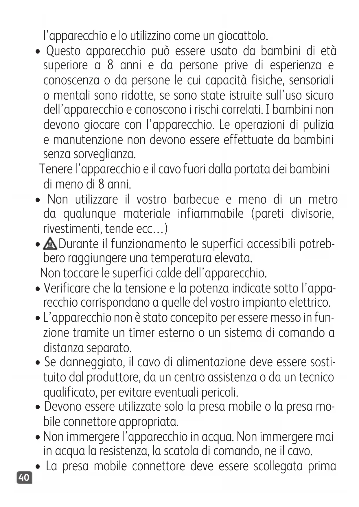 - Questo apparecchio può essere usato da bambini di età superiore a 8 anni e da persone prive di esperienza e conoscenza o da persone le cui capacità fisiche, sensoriali o mentali sono ridotte, se sono state istruite sull’uso sicuro dell’apparecchio e conoscono i rischi correlati. I bambini non devono giocare con l’apparecchio. Le operazioni di pulizia e manutenzione non devono essere effettuate da bambini senza sorveglianza. Tenere l’apparecchio e il cavo fuori dalla portata dei bambini di meno di 8 anni.
