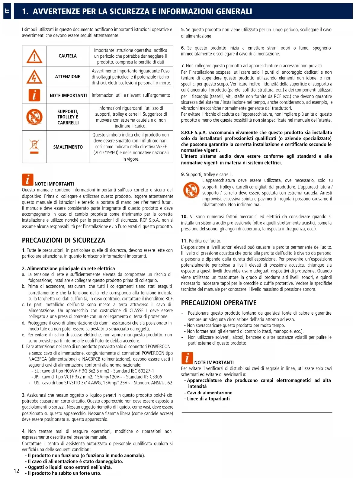 Informazioni riguardanti l’utilizzo di supporti, trolley e carrelli. Suggerisce di muovere con estrema cautela e di non inclinare il carico. SMALTIMENTO Questo simbolo indica che il prodotto non deve essere smaltito con i rifiuti ordinari, così come indicato nella direttiva WEEE (2012/19/EU) e nelle normative nazionali in vigore. NOTE IMPORTANTI Questo manuale contiene informazioni importanti sull’uso corretto e sicuro del dispositivo. Prima di collegare e utilizzare questo prodotto, leggere attentamente questo manuale di istruzioni e tenerlo a portata di mano per riferimenti futuri. Il manuale deve essere considerato parte integrante di questo prodotto e deve accompagnarlo in caso di cambio proprietà come riferimento per la corretta installazione e utilizzo nonché per le precauzioni di sicurezza. RCF S.p.A. non si assume alcuna responsabilità per l’installazione e / o l’uso errati di questo prodotto.