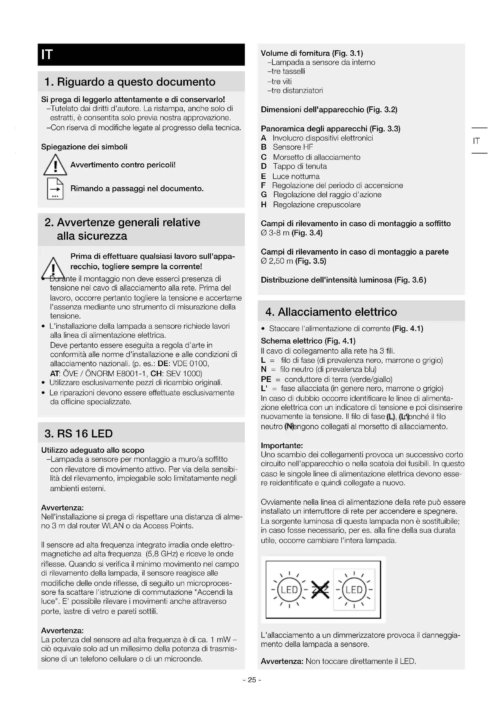 Volume di fornitura (Fig. 3.1) – Lampada a sensore da interno – tre tasselli – tre viti – tre distanziatori Dimensioni dell'apparecchio (Fig. 3.2) Panoramica degli apparecchi (Fig. 3.3) A Involucro dispositivi elettronici B Sensore HF C Morsetto di allacciamento D Tappo di tenuta E Luce notturna F Regolazione del periodo di accensione G Regolazione del raggio d'azione H Regolazione crepuscolare Campi di rilevamento in caso di montaggio a sotto Ø 3-8m (Fig. 3.4) Campi di rilevamento in caso di montaggio a parete Ø 2,50 m (Fig. 3.5) Distribuzione dell'intensità luminosa (Fig. 3.6 )