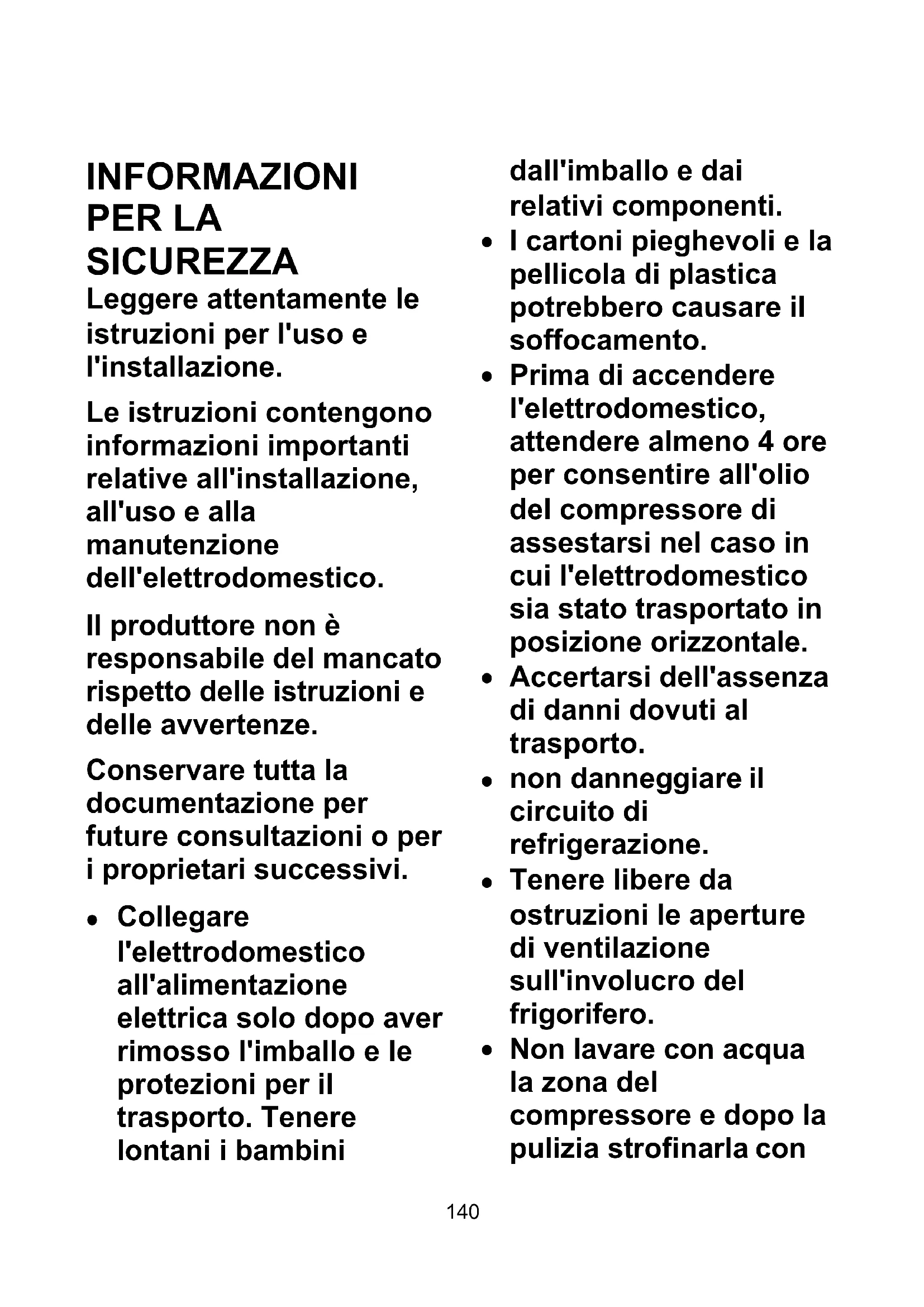 INFORMAZIONI PER LA SICUREZZA Leggere attentamente le istruzioni per l'uso e l'installazione. Le istruzioni contengono informazioni importanti relative all'installazione, all'uso e alla manutenzione dell'elettrodomestico. Il produttore non è responsabile del mancato rispetto delle istruzioni e delle avvertenze. Conservare tutta la documentazione per future consultazioni o per i proprietari successivi.