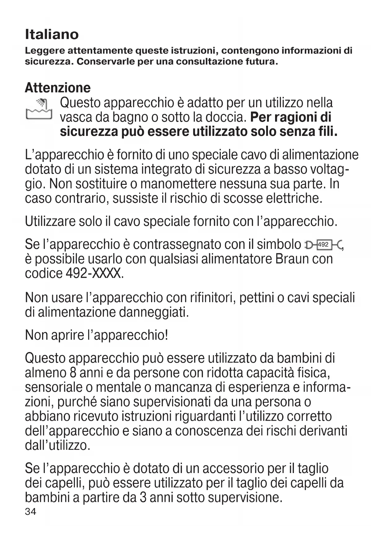 è possibile usarlo con qualsiasi alimentatore Braun con codice 492-XXXX. Non usare l’apparecchio con rifinitori, pettini o cavi speciali di alimentazione danneggiati. Non aprire l’apparecchio! Questo apparecchio può essere utilizzato da bambini di almeno 8 anni e da persone con ridotta capacità fisica, sensoriale o mentale o mancanza di esperienza e informa- zioni, purché siano supervisionati da una persona o abbiano ricevuto istruzioni riguardanti l’utilizzo corretto dell’apparecchio e siano a conoscenza dei rischi derivanti dall’utilizzo. Se l’apparecchio è dotato di un accessorio per il taglio dei capelli, può essere utilizzato per il taglio dei capelli da bambini a partire da 3 anni sotto supervisione. 91977969_Type5544_MGK7331_7330_7321_7320_MN_ANZ.indd 3491977969_Type5544_MGK7331_7330_7321_7320_MN_ANZ.indd 34 10.09.21 09:3810.09.21 09:3835 I bambini non devono giocare con l’apparecchio. La pulizia e la manutenzione dell’apparecchio non devono essere effettuate da bambini. Descrizione 1a Pettine da barba estraibile (3–11 mm con intervalli di 2 mm)* 1b Pettine da barba estraibile (13–21 mm con intervalli di 2 mm)* 1c Pulsante di rilascio dei pettini estraibili 1d Pettine fisso 1 (1 mm)*/** 1e Pettine fisso 2 (2 mm)*/** 2a Testina del rifinitore*/** 2b Testina del rifinitore naso e orecchie* 2c Testina del rifinitore di precisione* 2d Testina radente corpo* 2e Mini rasoio a lamina* 2f Testina rifinitore corpo* 2g Pettine aree sensibili* 3 Interruttore acceso/spento 4 Indicatore di ricarica 5 Presa di corrente 6 Set di cavi speciali** 7 Base di ricarica*