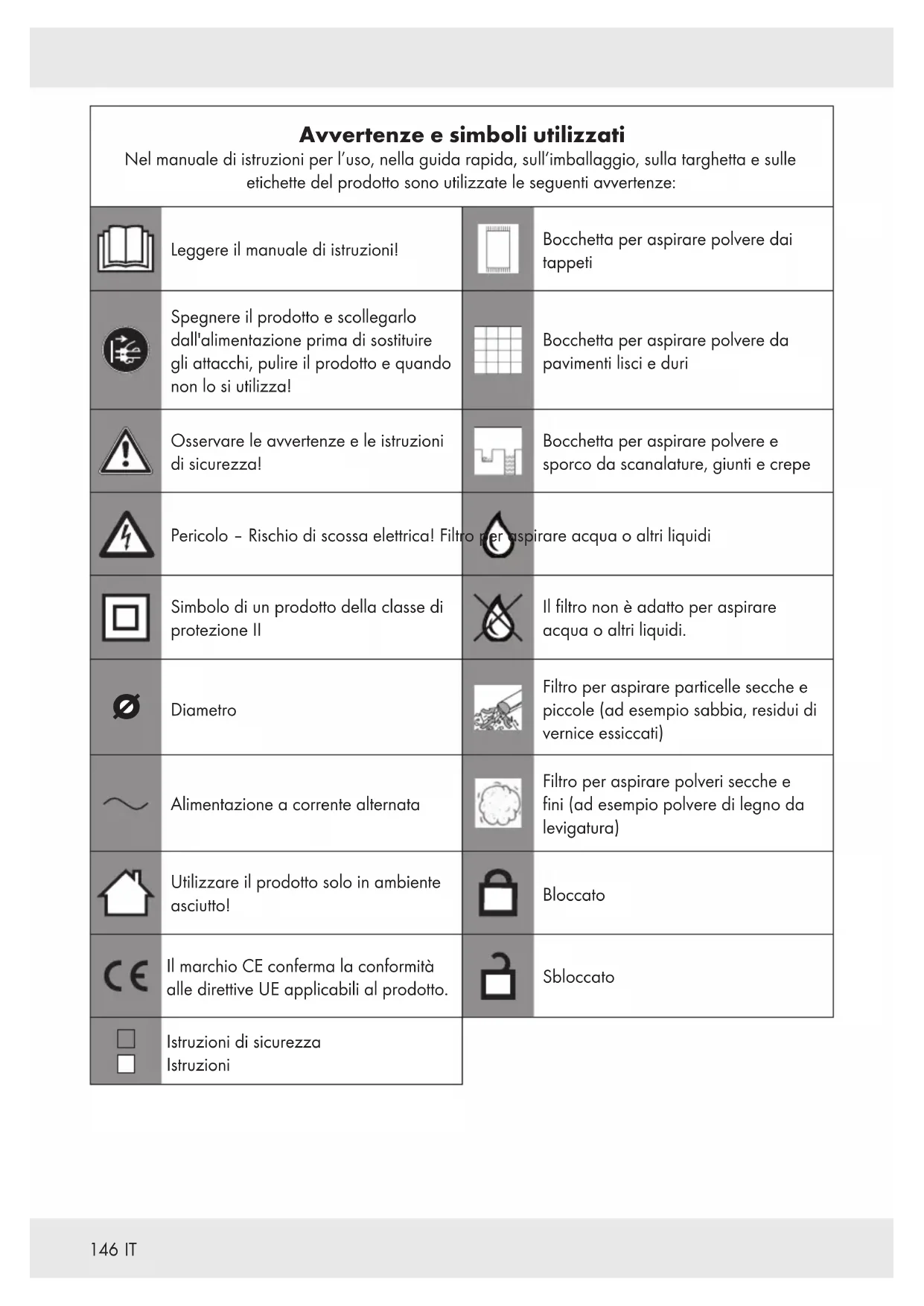 Avvertenze e simboli utilizzati Nel manuale di istruzioni per l’uso, nella guida rapida, sull’imballaggio, sulla targhetta e sulle etichette del prodotto sono utilizzate le seguenti avvertenze: Leggere il manuale di istruzioni! Bocchetta per aspirare polvere dai tappeti Spegnere il prodotto e scollegarlo dall'alimentazione prima di sostituire gli attacchi, pulire il prodotto e quando non lo si utilizza! Bocchetta per aspirare polvere da pavimenti lisci e duri Osservare le avvertenze e le istruzioni di sicurezza! Bocchetta per aspirare polvere e sporco da scanalature, giunti e crepe Pericolo – Rischio di scossa elettrica! Filtro per aspirare acqua o altri liquidi Simbolo di un prodotto della classe di protezione II Il filtro non è adatto per aspirare acqua o altri liquidi.