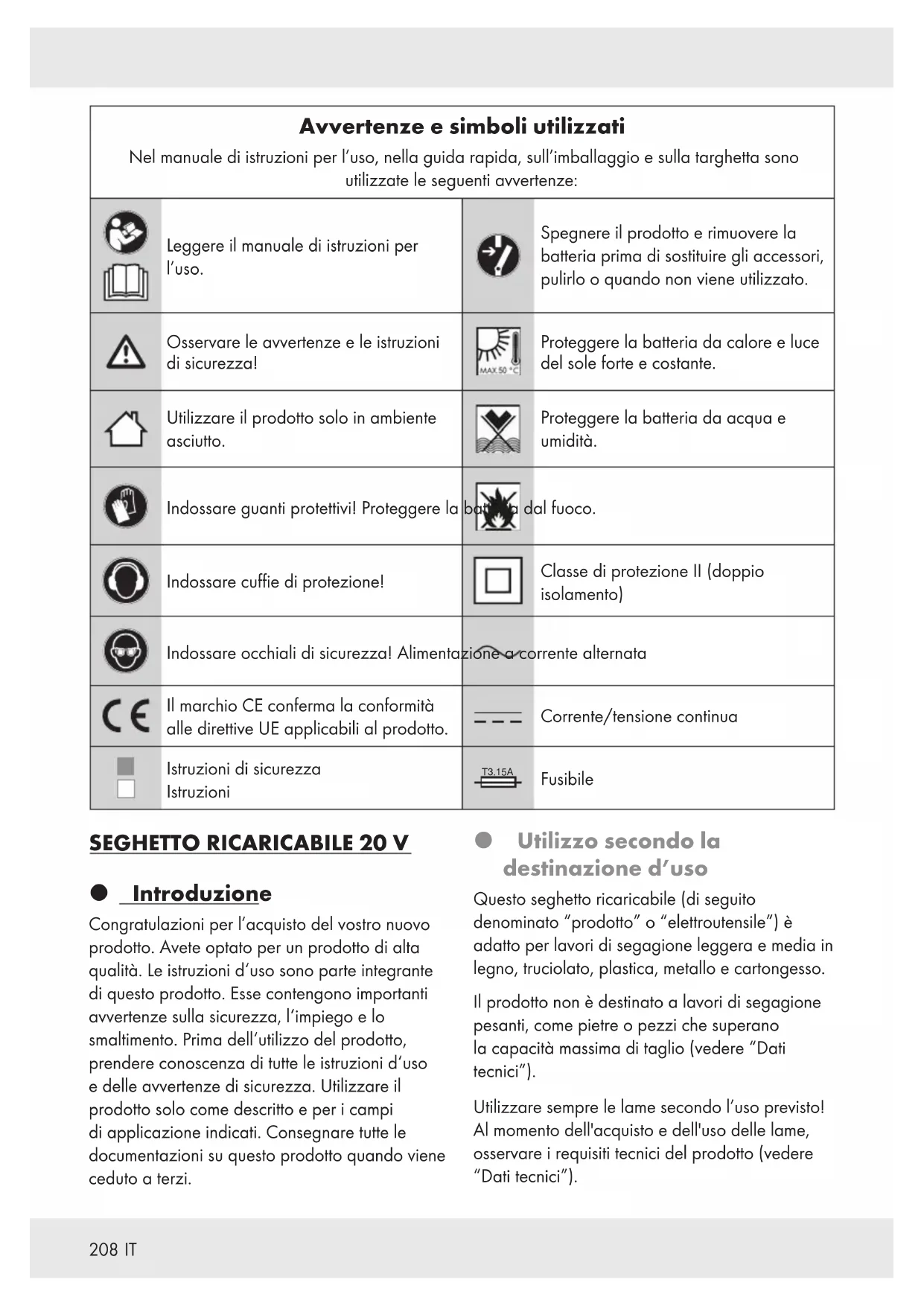 Introduzione Congratulazioni per l’acquisto del vostro nuovo prodotto. Avete optato per un prodotto di alta qualità. Le istruzioni d‘uso sono parte integrante di questo prodotto. Esse contengono importanti avvertenze sulla sicurezza, l‘impiego e lo smaltimento. Prima dell‘utilizzo del prodotto, prendere conoscenza di tutte le istruzioni d‘uso e delle avvertenze di sicurezza. Utilizzare il prodotto solo come descritto e per i campi di applicazione indicati. Consegnare tutte le documentazioni su questo prodotto quando viene ceduto a terzi. Utilizzo secondo la destinazione d’uso Questo seghetto ricaricabile (di seguito denominato “prodotto” o “elettroutensile”) è adatto per lavori di segagione leggera e media in legno, truciolato, plastica, metallo e cartongesso. Il prodotto non è destinato a lavori di segagione pesanti, come pietre o pezzi che superano la capacità massima di taglio (vedere “Dati tecnici”). Utilizzare sempre le lame secondo l’uso previsto! Al momento dell'acquisto e dell'uso delle lame, osservare i requisiti tecnici del prodotto (vedere “Dati tecnici”).209