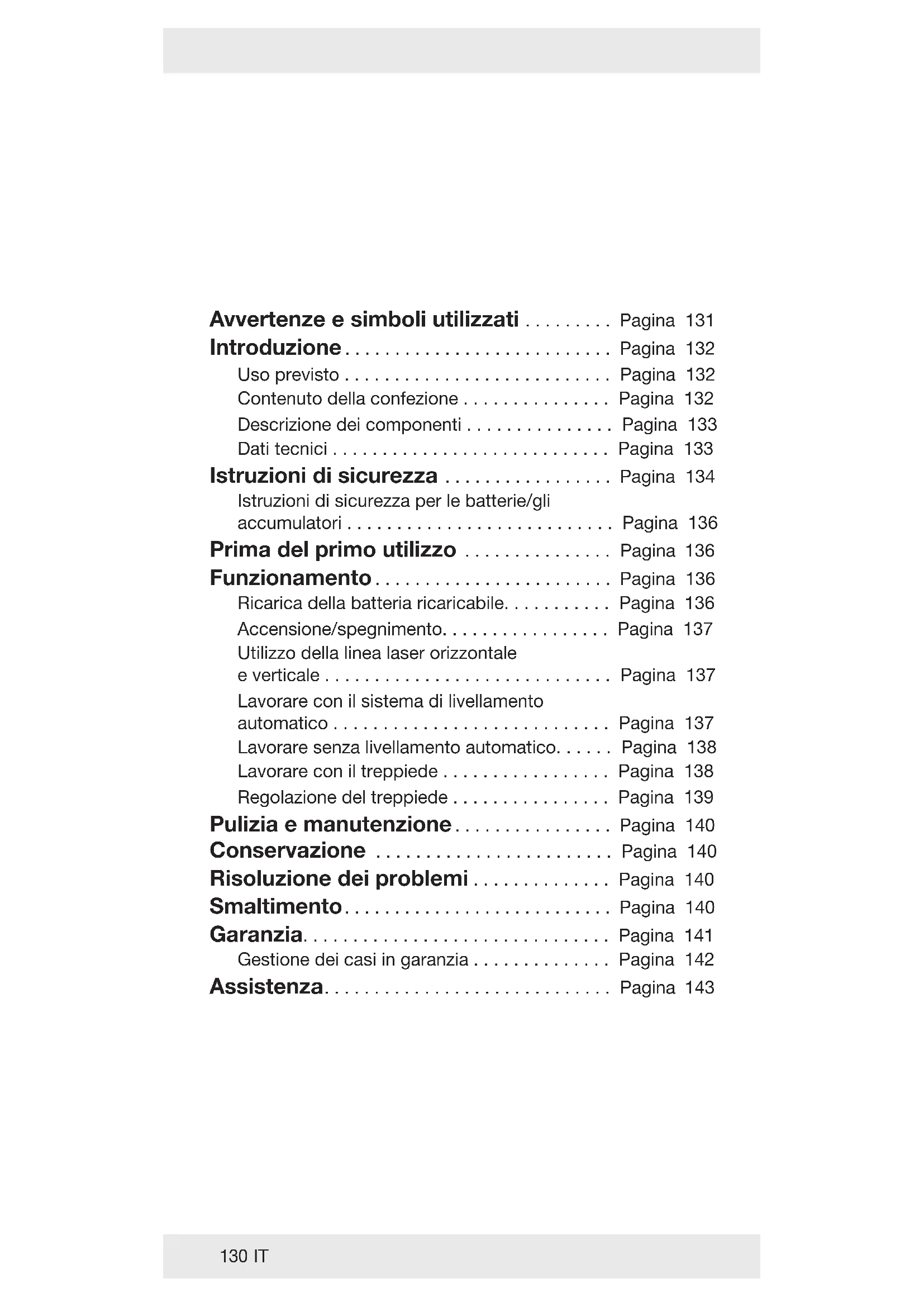 Avvertenze e simboli utilizzati ......... Pagina 131 Introduzione ........................... Pagina 132 Uso previsto ........................... Pagina 132 Contenuto della confezione ............... Pagina 132 Descrizione dei componenti ............... Pagina 133 Dati tecnici ............................ Pagina 133 Istruzioni di sicurezza ................. Pagina 134 Istruzioni di sicurezza per le batterie/gli accumulatori ........................... Pagina 136 Prima del primo utilizzo ............... Pagina 136 Funzionamento ........................ Pagina 136 Ricarica della batteria ricaricabile........... Pagina 136 Accensione/spegnimento................. Pagina 137 Utilizzo della linea laser orizzontale e verticale ............................. Pagina 137 Lavorare con il sistema di livellamento automatico ............................ Pagina 137 Lavorare senza livellamento automatico...... Pagina 138 Lavorare con il treppiede ................. Pagina 138 Regolazione del treppiede ................ Pagina 139 Pulizia e manutenzione ................ Pagina 140 Conservazione ........................ Pagina 140 Risoluzione dei problemi .............. Pagina 140 Smaltimento........................... Pagina 140 Garanzia............................... Pagina 141 Gestione dei casi in garanzia .............. Pagina 142 Assistenza............................. Pagina 143131