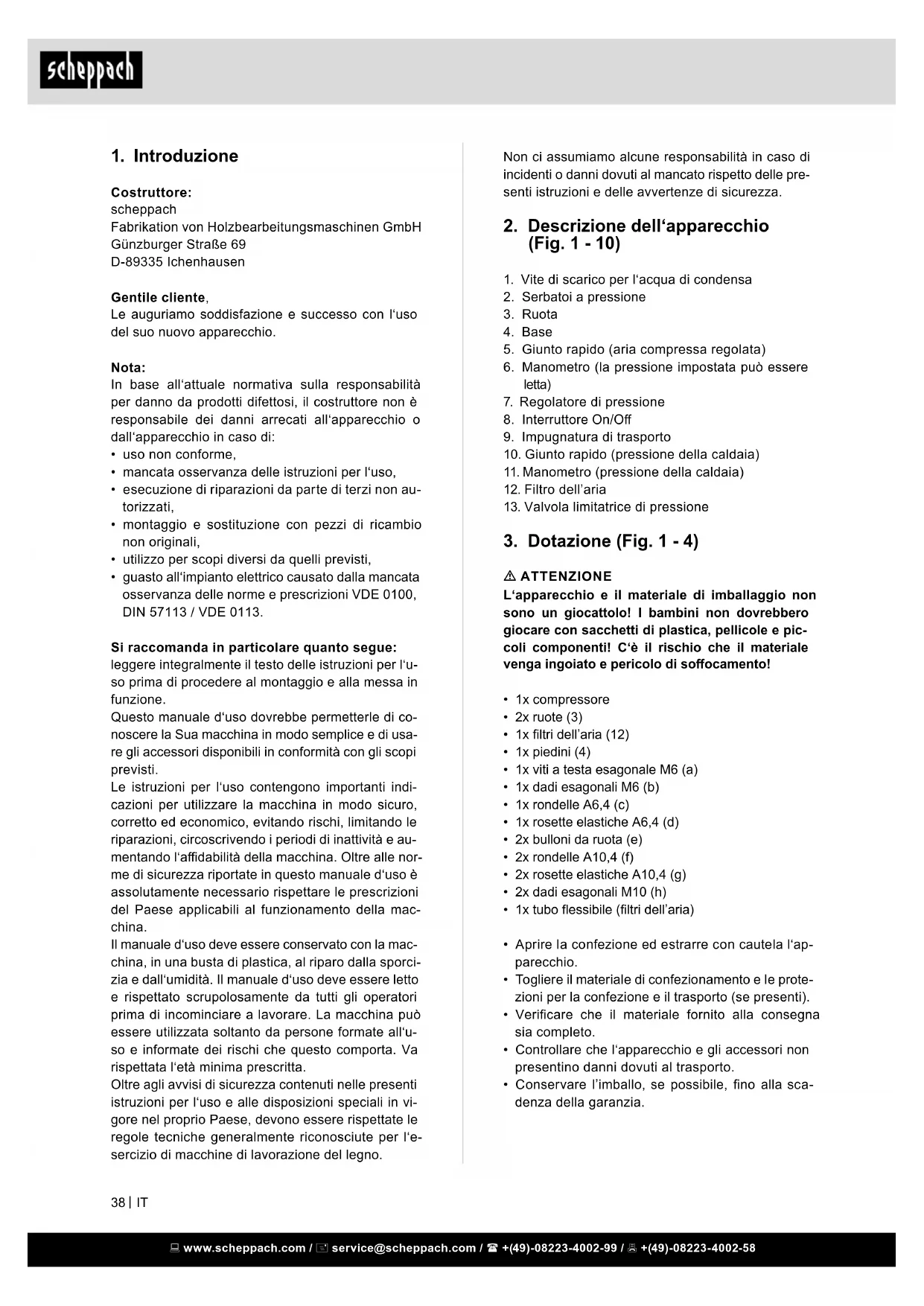 Costruttore: scheppach Fabrikation von Holzbearbeitungsmaschinen GmbH Günzburger Straße 69 D-89335 Ichenhausen Gentile cliente, Le auguriamo soddisfazione e successo con l‘uso del suo nuovo apparecchio. Nota: In base all‘attuale normativa sulla responsabilità per danno da prodotti difettosi, il costruttore non è responsabile dei danni arrecati all‘apparecchio o dall‘apparecchio in caso di: