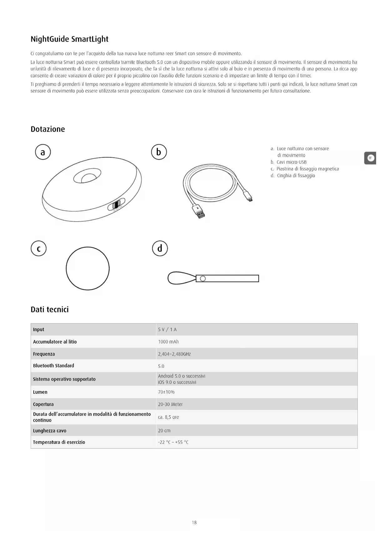 Sistema operativo supportato Android 5.0 o successivi iOS 9.0 o successivi Lumen 70±10% Copertura 20-30 Meter Durata dell’accumulatore in modalità di funzionamento continuo ca. 8,5 ore Lunghezza cavo 20 cm Temperatura di esercizio -22 °C – +55 °C Dati tecnici NightGuide SmartLight Ci congratuliamo con te per l’acquisto della tua nuova luce notturna reer Smart con sensore di movimento. La luce notturna Smart può essere controllata tramite Bluetooth 5.0 con un dispositivo mobile oppure utilizzando il sensore di movimento. Il sensore di movimento ha un’unità di rilevamento di luce e di presenza incorporato, che fa sì che la luce notturna si attivi solo al buio e in presenza di movimento di una persona. La ricca app consente di creare variazioni di colore per il proprio piccolino con l’ausilio delle funzioni scenario e di impostare un limite di tempo con il timer. Ti preghiamo di prenderti il tempo necessario a leggere attentamente le istruzioni di sicurezza. Solo se si rispettano tutti i punti qui indicati, la luce notturna Smart con sensore di movimento può essere utilizzata senza preoccupazioni. Conservare con cura le istruzioni di funzionamento per futura consultazione. Dotazione a. Luce notturna con sensore di movimento b. Cavi micro-USB c. Piastrina di fissaggio magnetica d. Cinghia di fissaggio