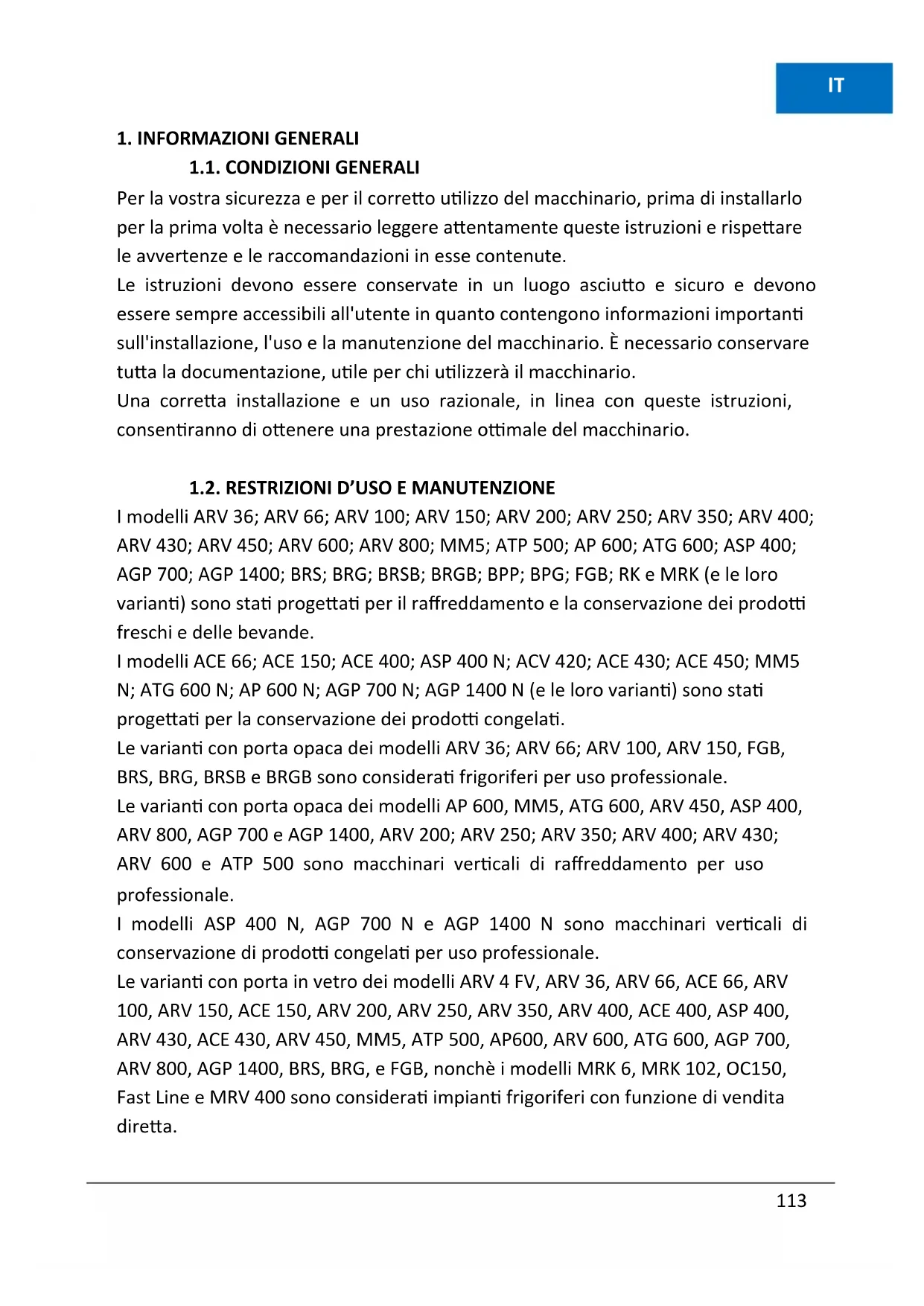 I modelli ARV 36; ARV 66; ARV 100; ARV 150; ARV 200; ARV 250; ARV 350; ARV 400; ARV 430; ARV 450; ARV 600; ARV 800; MM5; ATP 500; AP 600; ATG 600; ASP 400; AGP 700; AGP 1400; BRS; BRG; BRSB; BRGB; BPP; BPG; FGB; RK e MRK (e le loro varianti) sono stati progettati per il raffreddamento e la conservazione dei prodotti freschi e delle bevande. I modelli ACE 66; ACE 150; ACE 400; ASP 400 N; ACV 420; ACE 430; ACE 450; MM5 N; ATG 600 N; AP 600 N; AGP 700 N; AGP 1400 N (e le loro varianti) sono stati progettati per la conservazione dei prodotti congelati. Le varianti con porta opaca dei modelli ARV 36; ARV 66; ARV 100, ARV 150, FGB, BRS, BRG, BRSB e BRGB sono considerati frigoriferi per uso professionale. Le varianti con porta opaca dei modelli AP 600, MM5, ATG 600, ARV 450, ASP 400, ARV 800, AGP 700 e AGP 1400, ARV 200; ARV 250; ARV 350; ARV 400; ARV 430; ARV 600 e ATP 500 sono macchinari verticali di raffreddamento per uso professionale. I modelli ASP 400 N, AGP 700 N e AGP 1400 N sono macchinari verticali di conservazione di prodotti congelati per uso professionale. Le varianti con porta in vetro dei modelli ARV 4 FV, ARV 36, ARV 66, ACE 66, ARV 100, ARV 150, ACE 150, ARV 200, ARV 250, ARV 350, ARV 400, ACE 400, ASP 400, ARV 430, ACE 430, ARV 450, MM5, ATP 500, AP600, ARV 600, ATG 600, AGP 700, ARV 800, AGP 1400, BRS, BRG, e FGB, nonchè i modelli MRK 6, MRK 102, OC150, Fast Line e MRV 400 sono considerati impianti frigoriferi con funzione di vendita diretta.114