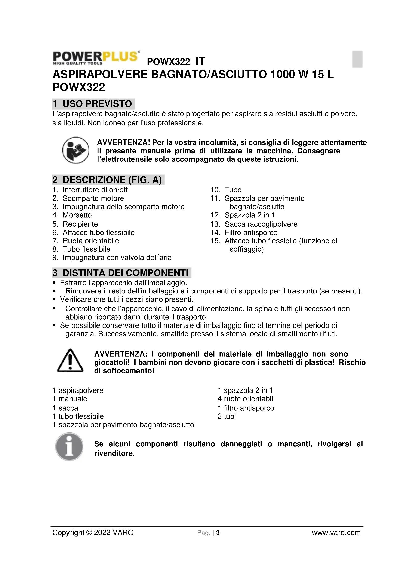 - Se possibile conservare tutto il materiale di imballaggio fino al termine del periodo di garanzia. Successivamente, smaltirlo presso il sistema locale di smaltimento rifiuti. AVVERTENZA: i componenti del materiale di imballaggio non sono giocattoli! I bambini non devono giocare con i sacchetti di plastica! Rischio di soffocamento! 1 aspirapolvere 1 manuale 1 sacca 1 tubo flessibile 1 spazzola per pavimento bagnato/asciutto 1 spazzola 2 in 1 4 ruote orientabili 1 filtro antisporco 3 tubi Se alcuni componenti risultano danneggiati o mancanti, rivolgersi al rivenditore.POWX322 IT Copyright © 2022 VARO Pag. | 4 www.varo.com 4 SIMBOLI Nel presente manuale e/o sull’apparecchio sono utilizzati i seguenti simboli: