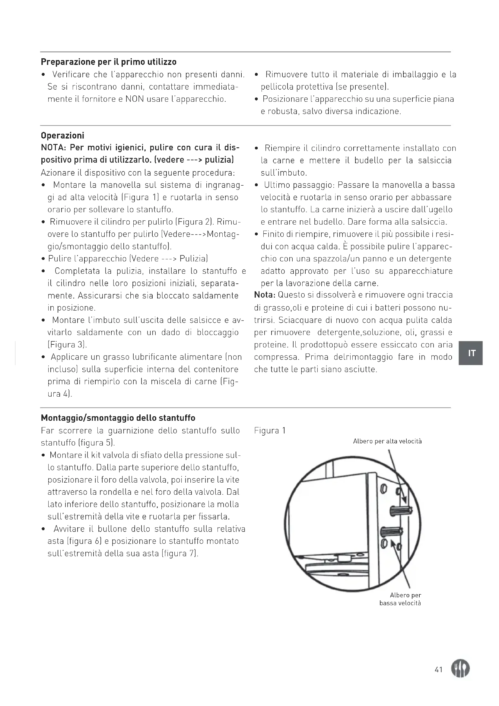 - Pulire le parti a diretto contatto con gli alimenti, vale a dire cilindro, imbuti, stantuffo, ecc. Us- are una spazzola/un panno e detergente adatto approvato per l’uso con apparecchiature per la lavorazione della carne.