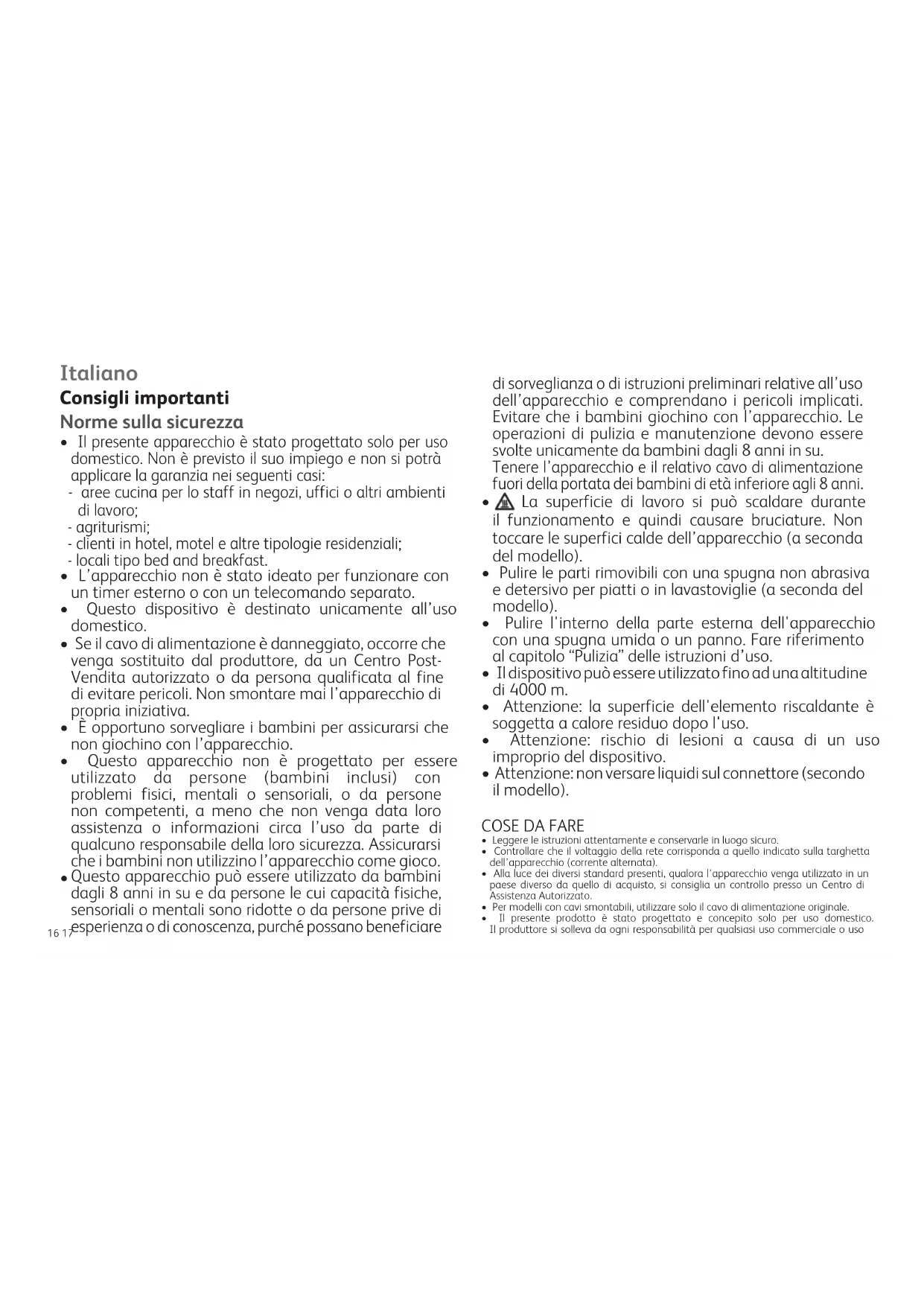 - Il presente apparecchio è stato progettato solo per uso domestico. Non è previsto il suo impiego e non si potrà applicare la garanzia nei seguenti casi: - aree cucina per lo staff in negozi, uffici o altri ambienti di lavoro; - agriturismi; - clienti in hotel, motel e altre tipologie residenziali; - locali tipo bed and breakfast.