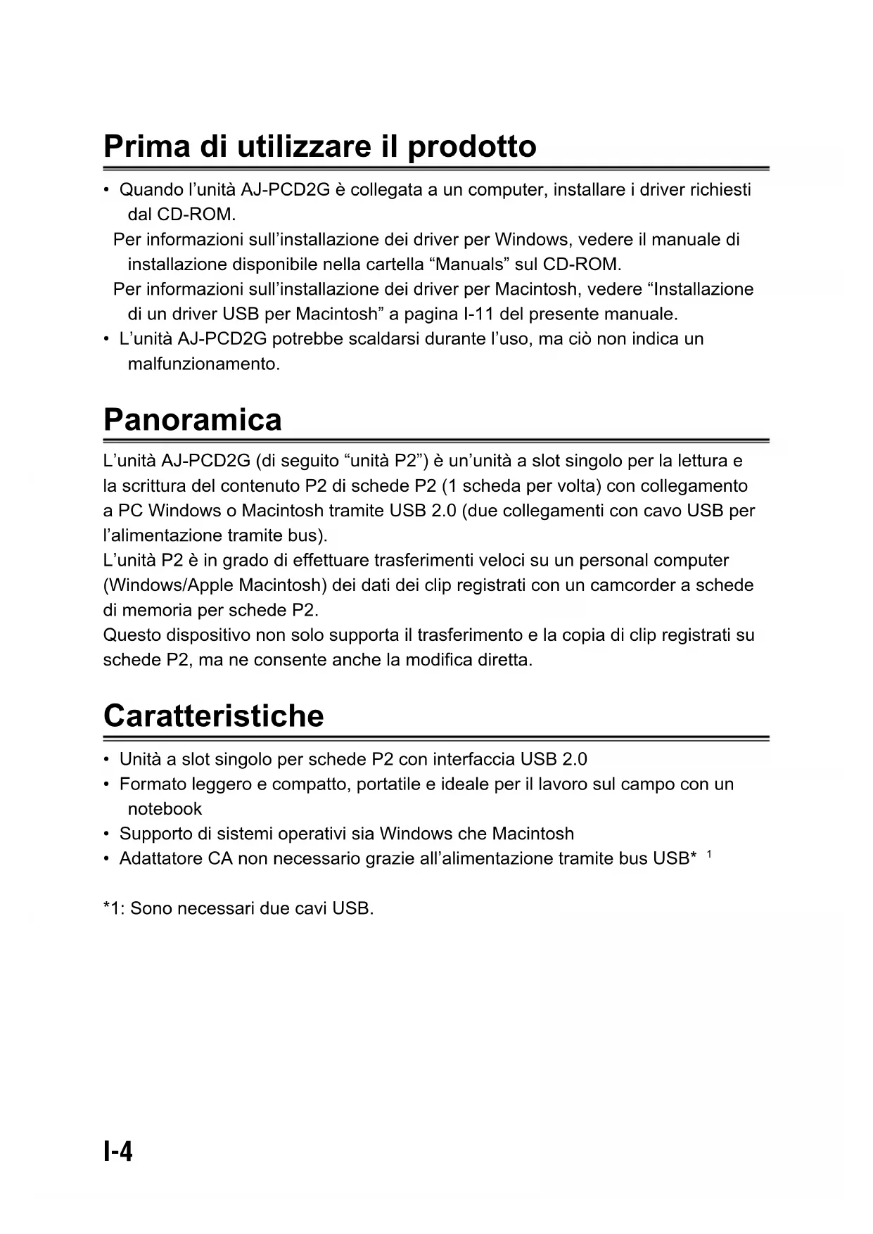 - Quando l’unità AJ-PCD2G è collegata a un computer, installare i driver richiesti dal CD-ROM. Per informazioni sull’installazione dei driver per Windows, vedere il manuale di installazione disponibile nella cartella “Manuals” sul CD-ROM. Per informazioni sull’installazione dei driver per Macintosh, vedere “Installazione di un driver USB per Macintosh” a pagina I-11 del presente manuale.