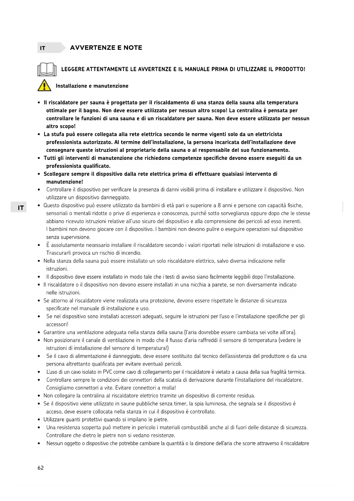- Nella stanza della sauna può essere installato un solo riscaldatore elettrico, salvo diversa indicazione nelle istruzioni.