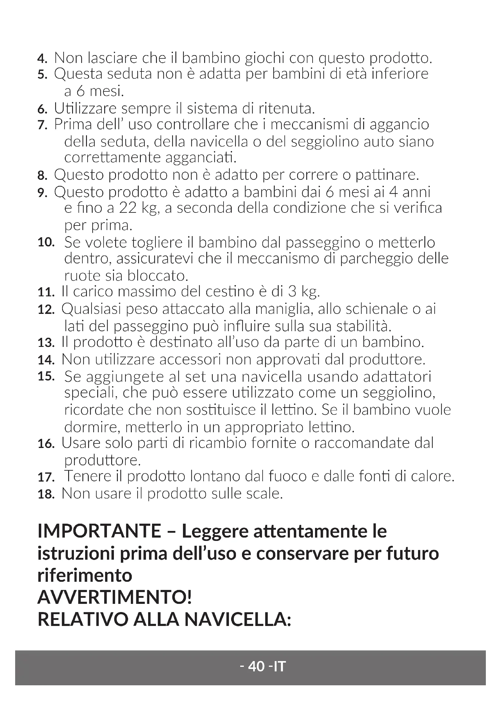 Se aggiungete al set una navicella usando adaatori speciali, che può essere ulizzato come un seggiolino, ricordate che non sostuisce il leno. Se il bambino vuole dormire, meerlo in un appropriato leno.