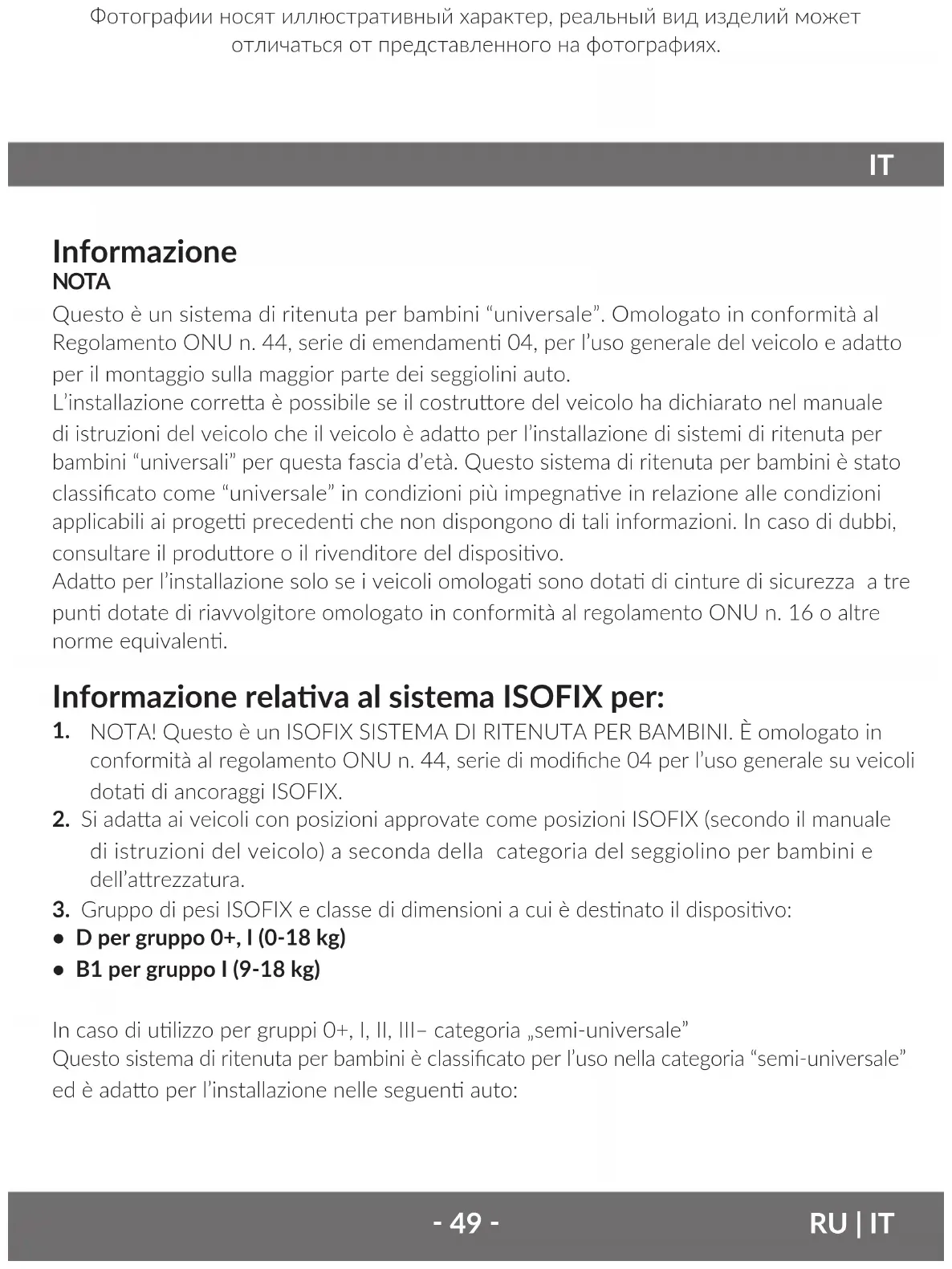 NOTA! Questo è un ISOFIX SISTEMA DI RITENUTA PER BAMBINI. È omologato in conformità al regolamento ONU n. 44, serie di modiche 04 per l’uso generale su veicoli dota di ancoraggi ISOFIX.