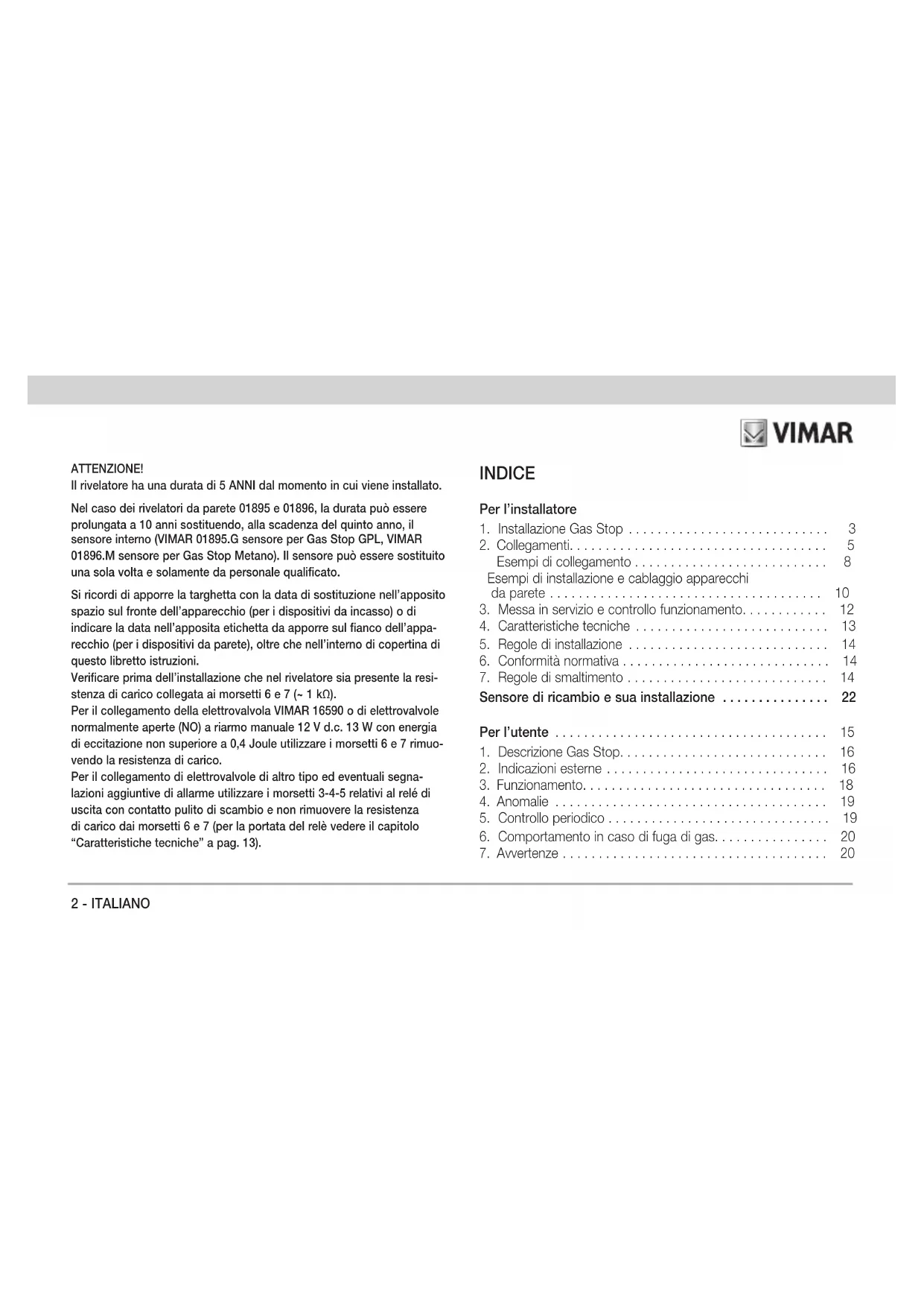 è inoltre possibile consegnare gratuitamente, senza obbligo di acquisto, i prodotti elettronici da smaltire con dimensioni inferiori a 25 cm. L’adeguata raccolta differenziata per l’av- vio successivo dell’apparecchiatura dismessa al riciclaggio, al trattamento e allo smaltimento ambientalmente compatibile contribuisce ad evitare pos- sibili effetti negativi sull’ambiente e sulla salute e favorisce il reimpiego e/o riciclo dei materiali di cui è composta l’apparecchiatura.ITALIANO - 15 Per l’utente ATTENZIONE Il rivelatore da Lei acquistato è un prodotto tecnologicamente avanzato, progettato e realizzato secondo le norme tecniche vigenti e le direttive CE. La sua durata è di 5 ANNI dal momento in cui viene installato. Nel caso dei rivelatori da parete 01895 e 01896, la durata può essere prolungata a 10 anni sostituendo, alla scadenza del quinto anno, il sensore interno (VIMAR 01895.G sensore per Gas Stop GPL, VIMAR 01896.M sensore per Gas Stop Metano). Il sensore può essere sostituito una sola volta e solamente da personale qualificato (vedi pag. 2). Legga attentamente le istruzioni utente. Si ricordi di contattare il Suo installatore alla data di scadenza per- ché provveda alla necessaria sostituzione dell’apparecchio. La data di scadenza deve essere apposta sull’apparecchio dal- l’installatore utilizzando l’apposita targhetta/etichetta al momento della messa in funzione.