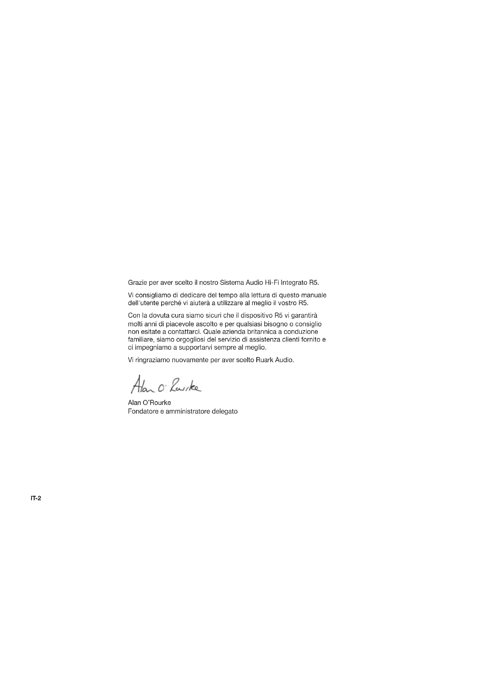 KRIT-2 Grazie per aver scelto il nostro Sistema Audio Hi-Fi Integrato R5. Vi consigliamo di dedicare del tempo alla lettura di questo manuale dell'utente perché vi aiuterà a utilizzare al meglio il vostro R5. Con la dovuta cura siamo sicuri che il dispositivo R5 vi garantirà molti anni di piacevole ascolto e per qualsiasi bisogno o consiglio non esitate a contattarci. Quale azienda britannica a conduzione familiare, siamo orgogliosi del servizio di assistenza clienti fornito e ci impegniamo a supportarvi sempre al meglio. Vi ringraziamo nuovamente per aver scelto Ruark Audio. Alan O’Rourke Fondatore e amministratore delegatoIT-3