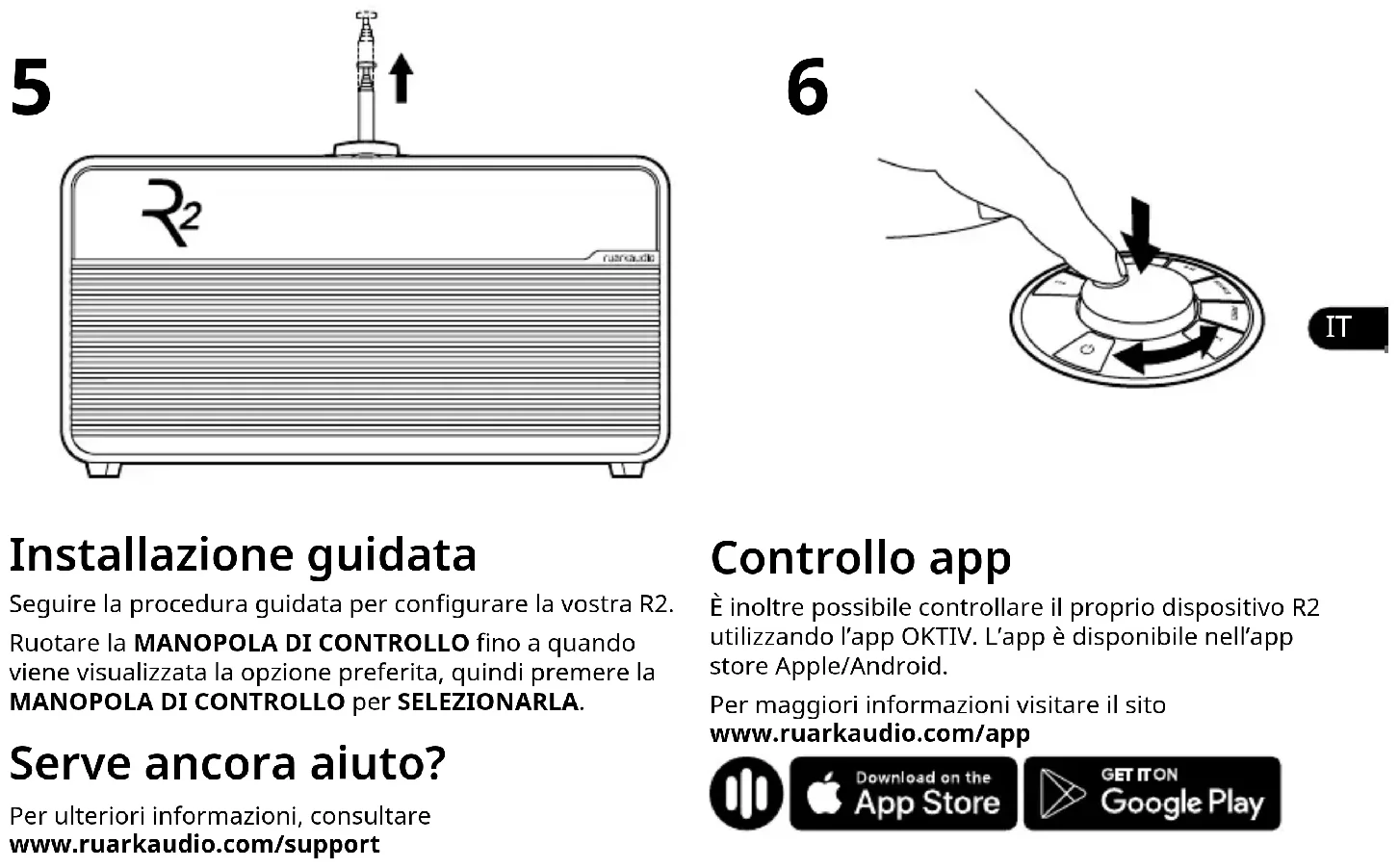 Connessione di un dispositivo diverso MENU > Collega dispositivo Selezionare Nuovo o ruotare la manopola di controllo per selezionare uno dei dispositivi esistenti nell’elenco di accoppiamento. È possibile accoppiare no a 8 dispositivi sebbene si potrà riprodurre audio solo da un dispositivo alla volta. Cancellazione dell’elenco dei dispositivi accoppiati MENU > Dimentica dispositivo La cancellazione dell’elenco dei dispositivi associati rimuove tutti i dispositivi ricordati e consente di iniziare un nuovo elenco collegando quelli che si desidera ricordare. Nome del dispositivo Potete cambiare il nome del dispositivo del R2 in qualcosa di più descrittivo come “Ozzie’s R2”, quindi verrà visualizzato nelle ricerche e nelle reti Bluetooth come “Ozzie’s R2”. Potete farlo dall’app complementare OKTIV. www.ruarkaudio.com/app Risoluzione dei problemi Assicurarsi che la funzione Bluetooth sul vostro dispositivo sia attiva e selezionate “Ruark R2” dall’elenco dei dispositivi disponibili. Potrebbero essere necessari alcuni secondi prima che la R2 venga visualizzata nell’elenco sul vostro dispositivo e in alcuni casi potrebbe essere necessario inserire “0000” come password di accoppiamento. Se avete problemi a connettere il vostro dispositivo Bluetooth, vi consigliamo di cancellare l’elenco dei dispositivi associati. Sarà inoltre necessario cancellare Ruark R2 dall’elenco dei dispositivi accoppiati del proprio dispositivo Bluetooth prima di riaccoppiarlo alla R2. Per maggiori informazioni consultare la documentazione relativa al proprio dispositivo Bluetooth. Chi avesse bisogno di aiuto per utilizzare il Bluetooth può visitare il sito www.ruarkaudio.com/support Nota: non è possibile utilizzare la funzione Bluetooth della R2 per collegare cue BluetoothRadio DAB La prima volta che si utilizza DAB sulla R2, o se l'elenco delle stazioni è vuoto, il dispositivo eseguirà automaticamente una scansione completa alla ricerca di stazioni DAB disponibili. Cambio di stazione Premere o per sintonizzare la stazione successiva o precedente. È inoltre possibile visualizzare l’elenco delle stazioni selezionando MENU> Elenco stazioni. Testo radio DAB (DLS) MENU > Info Seleziona le informazioni sul programma da visualizzare. Salvataggio preimpostazione Tenere premuto PRESET per due secondi e selezionare un preset per salvare la stazione attualmente in riproduzione. Potete salvare 8 preset. Richiamo di una preimpostazione Premere PRESET e selezionare una stazione. Scansione delle stazioni MENU > Ricerca stazioni Raccomandiamo di aggiornare periodicamente l’elenco delle stazioni con una scansione delle stazioni. Se l’elenco delle stazioni è vuoto, la radio eseguirà automaticamente una scansione delle stazioni non appena si passa a DAB. Per una ricezione ottimale allungare al massimo l’antenna e regolarne la posizione.EN