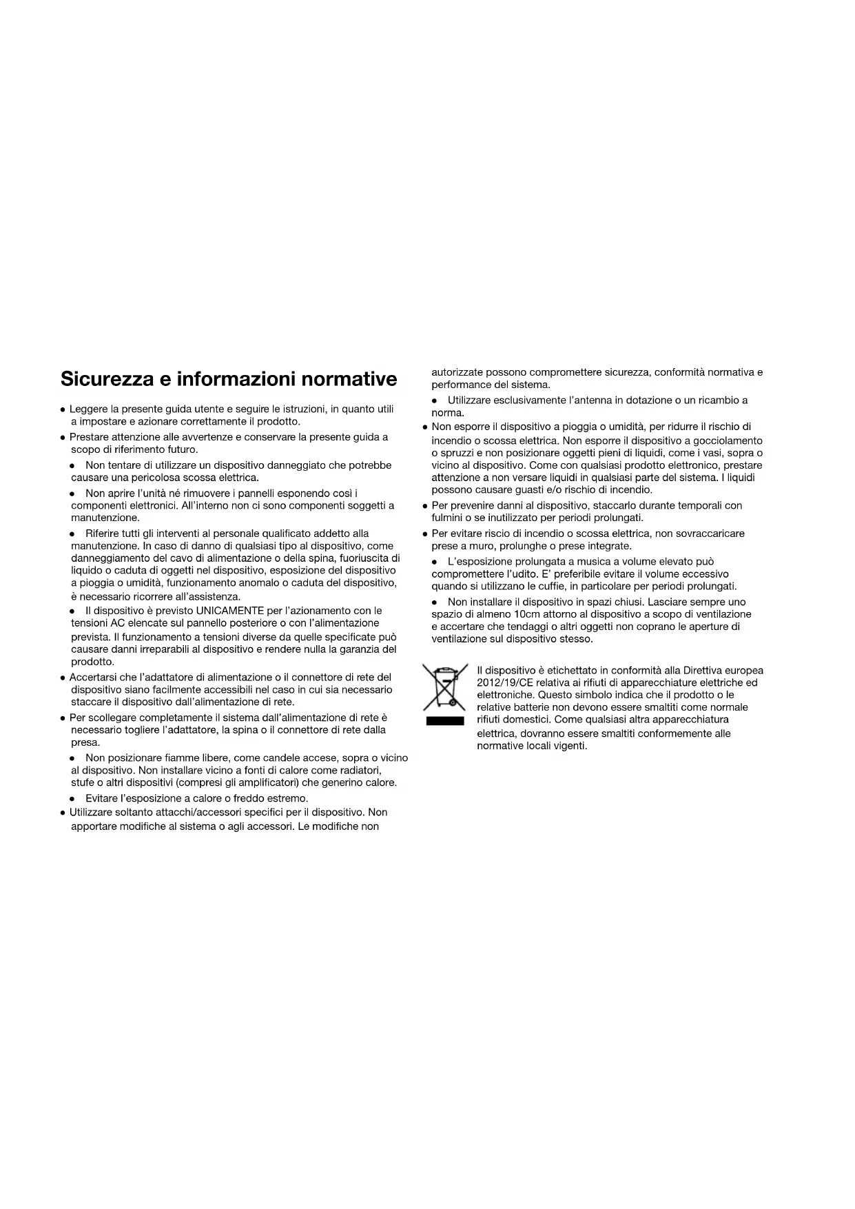 Manuale dell’utenteSicurezza e informazioni normative ● Leggere la presente guida utente e seguire le istruzioni, in quanto utili a impostare e azionare correttamente il prodotto. ● Prestare attenzione alle avvertenze e conservare la presente guida a scopo di riferimento futuro. ● Non tentare di utilizzare un dispositivo danneggiato che potrebbe causare una pericolosa scossa elettrica. ● Non aprire l’unità né rimuovere i pannelli esponendo così i componenti elettronici. All’interno non ci sono componenti soggetti a manutenzione. ● Riferire tutti gli interventi al personale qualicato addetto alla manutenzione. In caso di danno di qualsiasi tipo al dispositivo, come danneggiamento del cavo di alimentazione o della spina, fuoriuscita di liquido o caduta di oggetti nel dispositivo, esposizione del dispositivo a pioggia o umidità, funzionamento anomalo o caduta del dispositivo, è necessario ricorrere all’assistenza. ● Il dispositivo è previsto UNICAMENTE per l’azionamento con le tensioni AC elencate sul pannello posteriore o con l’alimentazione prevista. Il funzionamento a tensioni diverse da quelle specicate può causare danni irreparabili al dispositivo e rendere nulla la garanzia del prodotto. ● Accertarsi che l’adattatore di alimentazione o il connettore di rete del dispositivo siano facilmente accessibili nel caso in cui sia necessario staccare il dispositivo dall’alimentazione di rete. ● Per scollegare completamente il sistema dall’alimentazione di rete è necessario togliere l’adattatore, la spina o il connettore di rete dalla presa. ● Non posizionare amme libere, come candele accese, sopra o vicino al dispositivo. Non installare vicino a fonti di calore come radiatori, stufe o altri dispositivi (compresi gli amplicatori) che generino calore. ● Evitare l’esposizione a calore o freddo estremo. ● Utilizzare soltanto attacchi/accessori specici per il dispositivo. Non apportare modiche al sistema o agli accessori. Le modiche non autorizzate possono compromettere sicurezza, conformità normativa e performance del sistema. ● Utilizzare esclusivamente l’antenna in dotazione o un ricambio a norma. ● Non esporre il dispositivo a pioggia o umidità, per ridurre il rischio di incendio o scossa elettrica. Non esporre il dispositivo a gocciolamento o spruzzi e non posizionare oggetti pieni di liquidi, come i vasi, sopra o vicino al dispositivo. Come con qualsiasi prodotto elettronico, prestare attenzione a non versare liquidi in qualsiasi parte del sistema. I liquidi possono causare guasti e/o rischio di incendio. ● Per prevenire danni al dispositivo, staccarlo durante temporali con fulmini o se inutilizzato per periodi prolungati. ● Per evitare riscio di incendio o scossa elettrica, non sovraccaricare prese a muro, prolunghe o prese integrate. ● L’esposizione prolungata a musica a volume elevato può compromettere l’udito. E’ preferibile evitare il volume eccessivo quando si utilizzano le cufe, in particolare per periodi prolungati. ● Non installare il dispositivo in spazi chiusi. Lasciare sempre uno spazio di almeno 10cm attorno al dispositivo a scopo di ventilazione e accertare che tendaggi o altri oggetti non coprano le aperture di ventilazione sul dispositivo stesso. Il dispositivo è etichettato in conformità alla Direttiva europea 2012/19/CE relativa ai riuti di apparecchiature elettriche ed elettroniche. Questo simbolo indica che il prodotto o le relative batterie non devono essere smaltiti come normale riuti domestici. Come qualsiasi altra apparecchiatura elettrica, dovranno essere smaltiti conformemente alle normative locali vigenti.IT