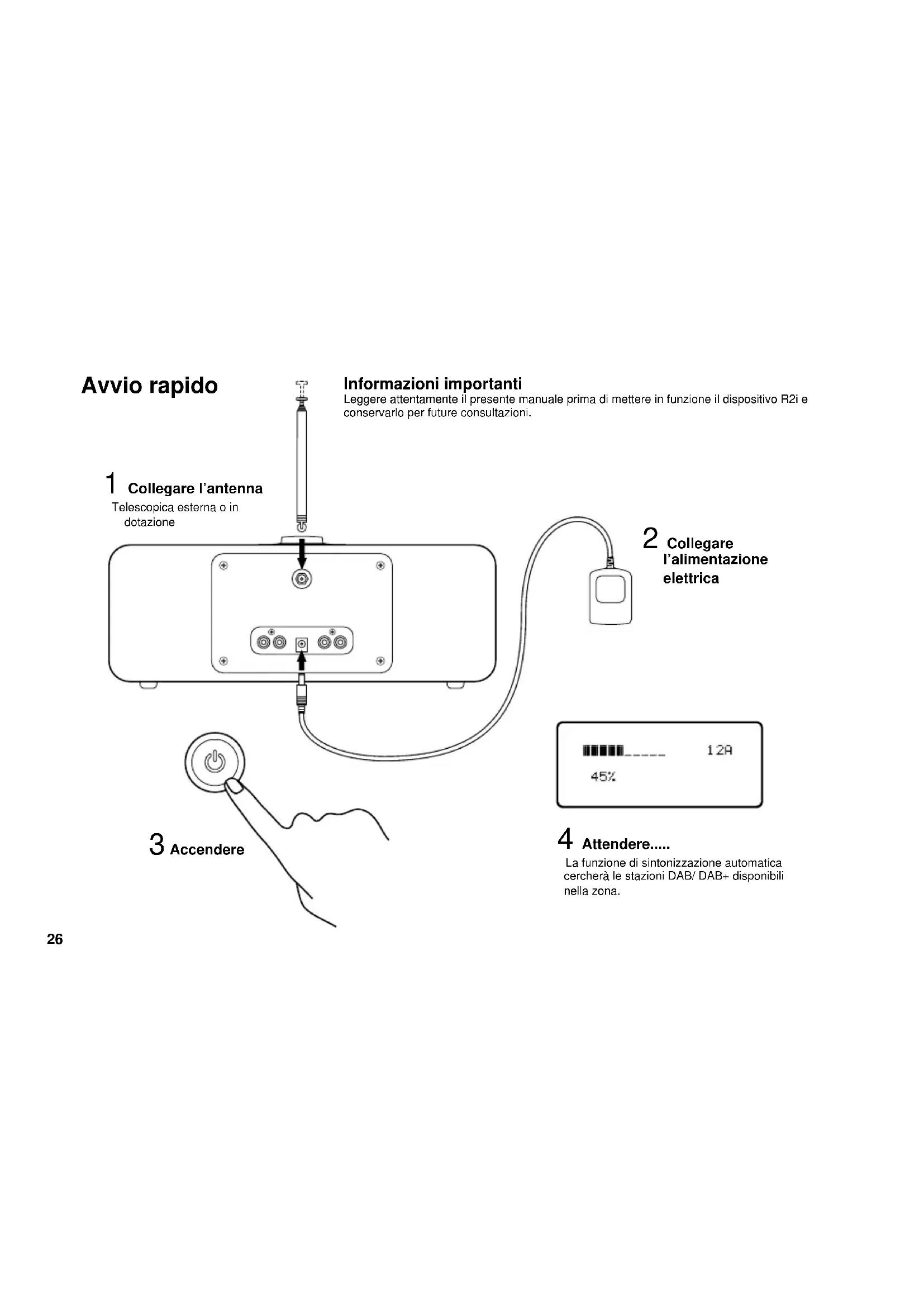 Specifiche ● DAB e DAB+ sintonizzatore stereo compatibile ● FM sintonizzatore stereo 87.5 – 108 MHz con RDS ● Il dock universale per iPod supporta tutti gli attuali modelli di iPod (30-pin) prodotti dal gennaio 2004 in avanti ● Uscita della cufa da 3,5 mm sul pannello anteriore ● RCA uscite fono sse sul pannello anteriore ● 2 altoparlanti da 3.5” full range ● Uscita alimentazione nominale 2 x 10 w ● Antenna: telescopica amovibile con connettore tipo F ● Dimensioni: H 120 x L 340 x P 185 mm ● Peso: 3,5 kg Alimentazione R2i ● Alimentazione ingresso da 100 V a 240 V CC 50-60Hz 0.5A ● Uscita alimentazione 12 V CC 2.0AUser guide Guide de l’utilisateur Bedienungsanleitung Manuale utente Manual de instrucciones Brukerveiledning Gebruikershandleiding