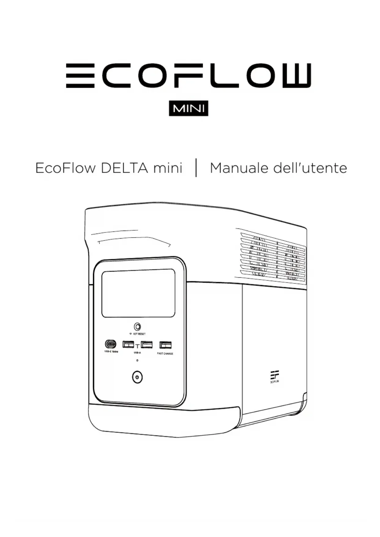 passe en mode veille profonde. Dans ce cas, chargez le produit avant de l'utiliser à nouveau.EcoFlow DELTA mini Manuale dell'utenteEcoFlow DELTA mini Manuale dell'utente Leggere attentamente tutti i suggerimenti sulla sicurezza, i messaggi di avviso, i termini di utilizzo e le dichiarazioni di non responsabilità. Prima dell'uso, fare riferimento ai termini di utilizzo e alla dichiarazione di non responsabilità all'indirizzo https://ecoflow.com/pages/terms-of-use e agli adesivi sul prodotto. Gli utenti si assumono la piena responsabilità di tutti gli usi e le operazioni. Familiarizzare con le normative in vigore nella propria zona. L'utente è l'unico responsabile della conoscenza di tutte le normative pertinenti e dell'uso conforme dei prodotti EcoFlow.