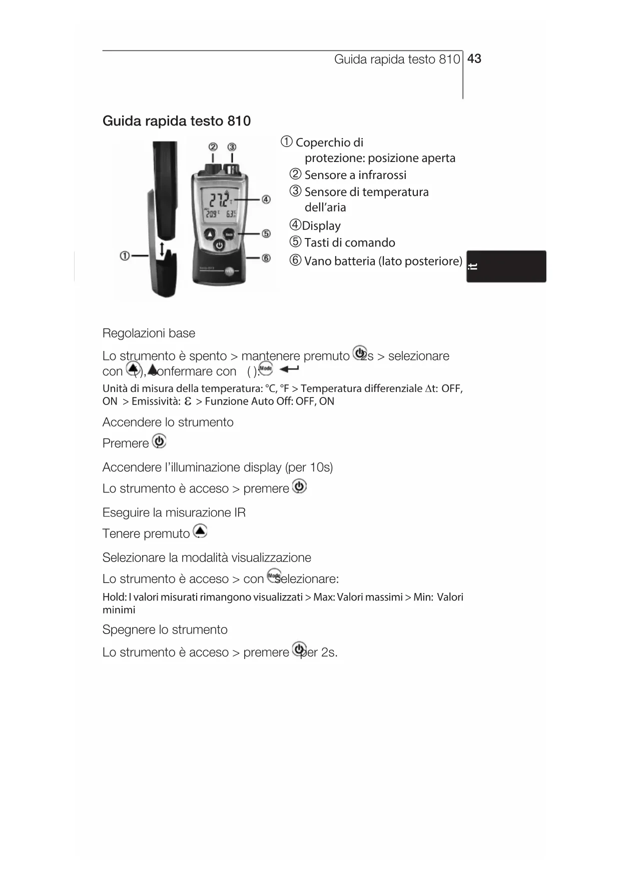 Guida rapida testo 810 À Coperchio di protezione: posizione aperta Á Sensore a infrarossi  Sensore di temperatura dell’aria à Display Ä Tasti di comando Å Vano batteria (lato posteriore) Regolazioni base Lo strumento è spento > mantenere premuto 2s > selezionare con ( ), confermare con ( ): Unità di misura della temperatura: °C, °F > Temperatura differenziale Dt: OFF, ON > Emissività: e > Funzione Auto Off: OFF, ON Accendere lo strumento Premere . Accendere l’illuminazione display (per 10s) Lo strumento è acceso > premere . Eseguire la misurazione IR Tenere premuto . Selezionare la modalità visualizzazione Lo strumento è acceso > con selezionare: Hold: I valori misurati rimangono visualizzati > Max: Valori massimi > Min: Valori minimi Spegnere lo strumento Lo strumento è acceso > premere per 2s.