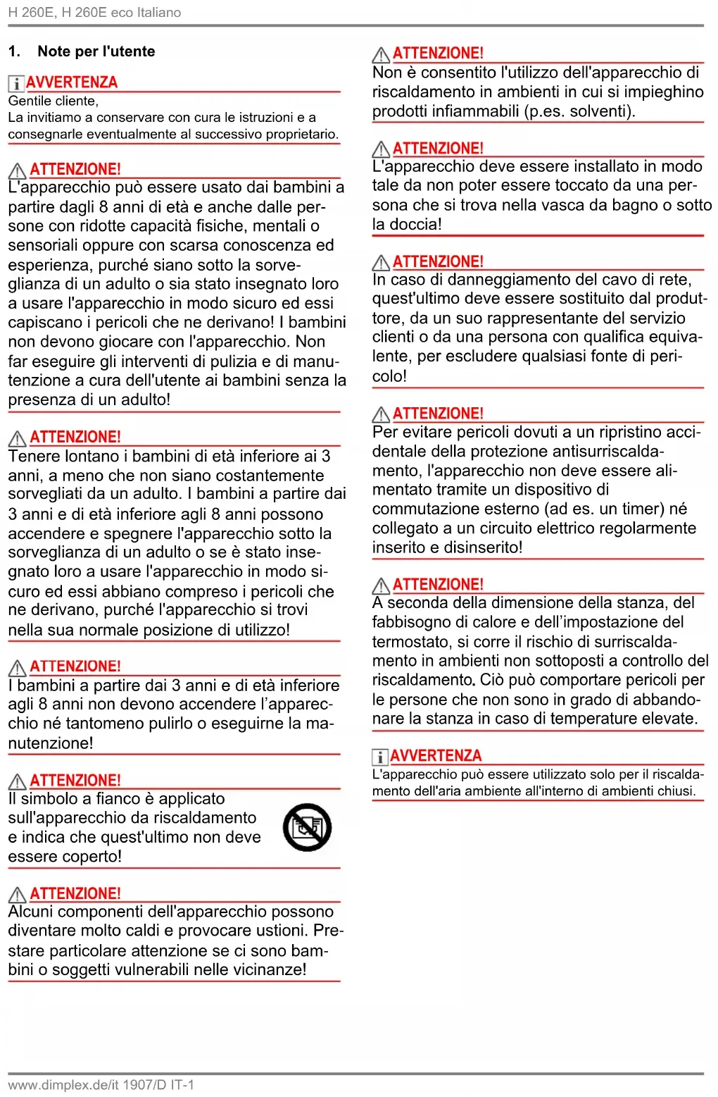 Ciò può comportare pericoli per le persone che non sono in grado di abbando- nare la stanza in caso di temperature elevate. AVVERTENZA L'apparecchio può essere utilizzato solo per il riscalda- mento dell'aria ambiente all'interno di ambienti chiusi.IT-2 1907/D www.dimplex.de/it Italiano H 260E, H 260E eco