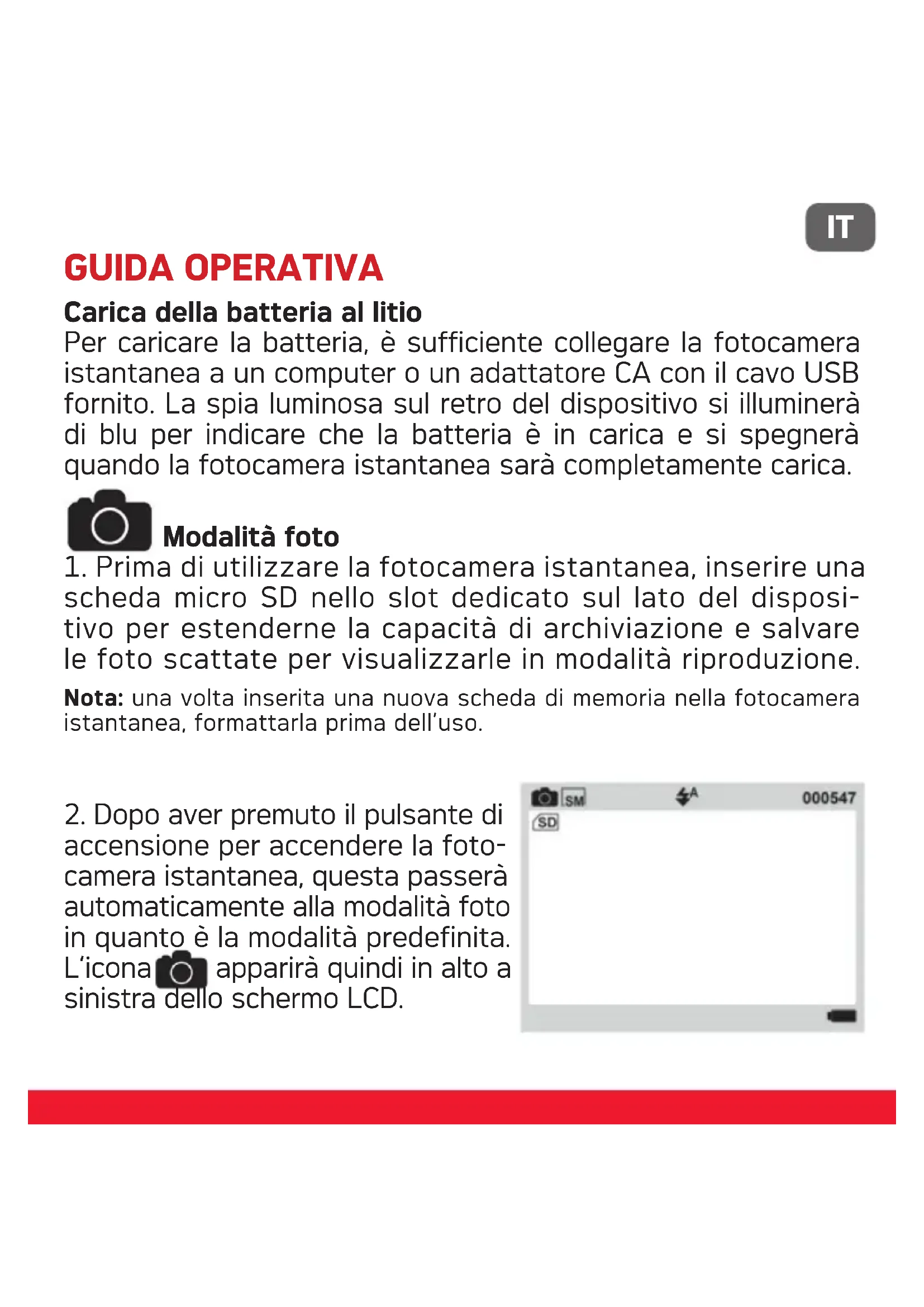 accensione per accendere la foto- camera istantanea, questa passerà automaticamente alla modalità foto in quanto è la modalità predefinita. L’icona apparirà quindi in alto a sinistra dello schermo LCD.IT