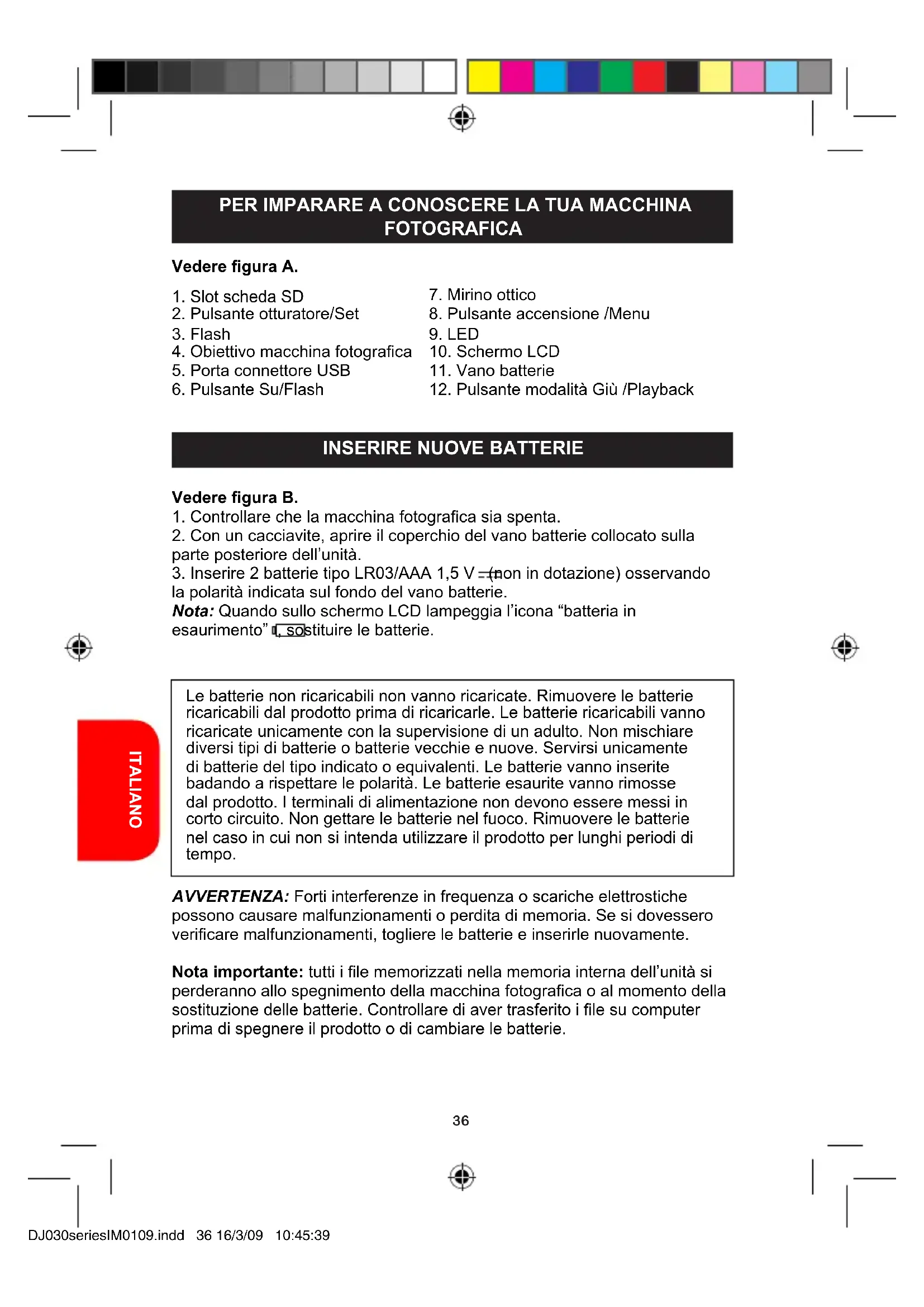 la polarità indicata sul fondo del vano batterie. Nota: Quando sullo schermo LCD lampeggia l’icona “batteria in esaurimento” , sostituire le batterie. Le batterie non ricaricabili non vanno ricaricate. Rimuovere le batterie ricaricabili dal prodotto prima di ricaricarle. Le batterie ricaricabili vanno ricaricate unicamente con la supervisione di un adulto. Non mischiare diversi tipi di batterie o batterie vecchie e nuove. Servirsi unicamente di batterie del tipo indicato o equivalenti. Le batterie vanno inserite badando a rispettare le polarità. Le batterie esaurite vanno rimosse dal prodotto. I terminali di alimentazione non devono essere messi in corto circuito. Non gettare le batterie nel fuoco. Rimuovere le batterie nel caso in cui non si intenda utilizzare il prodotto per lunghi periodi di tempo. AVVERTENZA: Forti interferenze in frequenza o scariche elettrostiche possono causare malfunzionamenti o perdita di memoria. Se si dovessero vericare malfunzionamenti, togliere le batterie e inserirle nuovamente. Nota importante: tutti i le memorizzati nella memoria interna dell’unità si perderanno allo spegnimento della macchina fotograca o al momento della sostituzione delle batterie. Controllare di aver trasferito i le su computer prima di spegnere il prodotto o di cambiare le batterie. Vedere gura A. DJ030seriesIM0109.indd 36 16/3/09 10:45:3937 ITALIANO